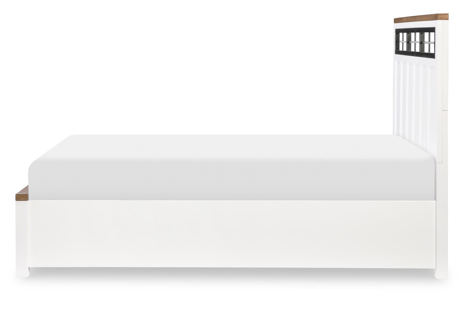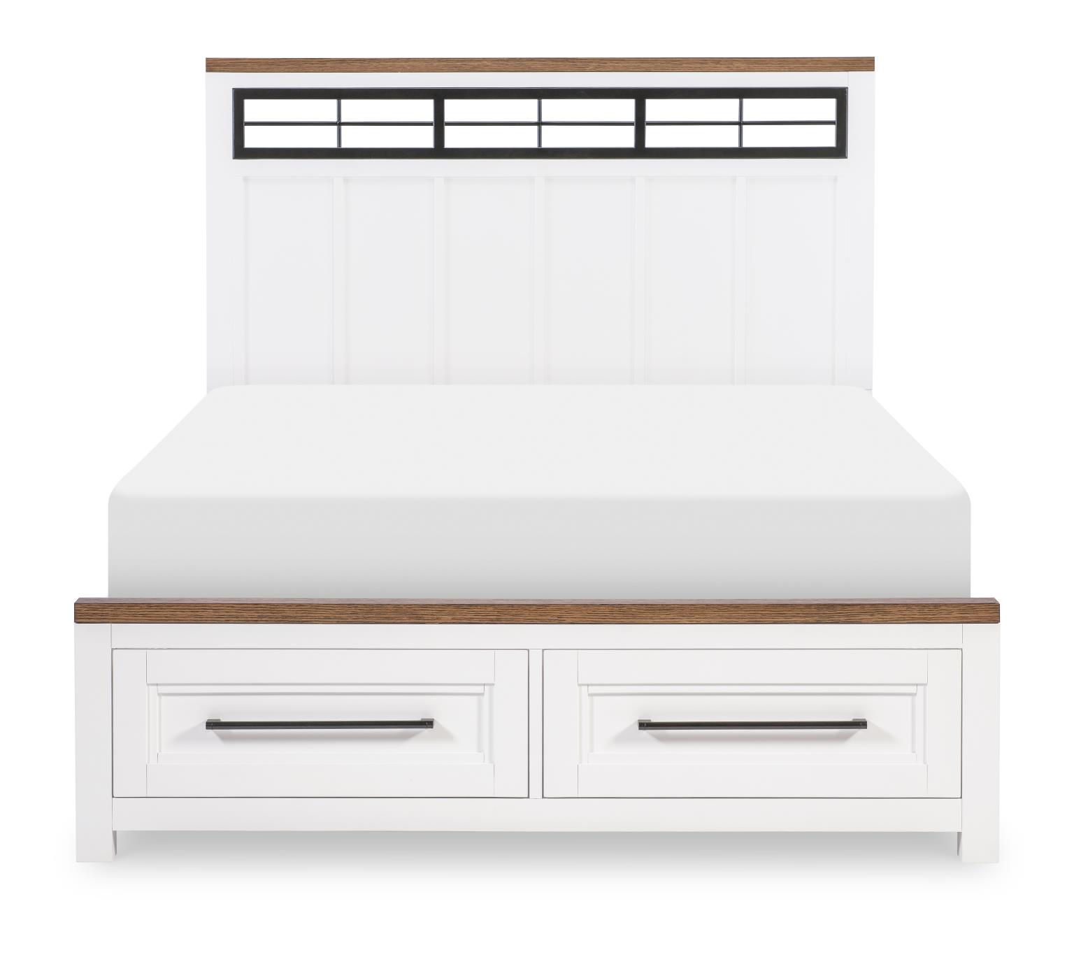 Crafted of Hardwood with Flat-Cut White Oak Veneer tops and Birch Veneer bases, the collection contrasts a painted white finish on the cases with Toasted Oak tops. Black accents include raised leg bases, simple bar-pull hardware, and a black metal windowpane detail in the headboard. Featuring English Dovetail fronts and backs and ball-bearing metal drawer guides mounted to the drawer sides, the collection offers a storage footboard option for extra storage space. With an updated sophisticated look, this collection is suitable for tweens, teens, young adults and for second bedrooms.