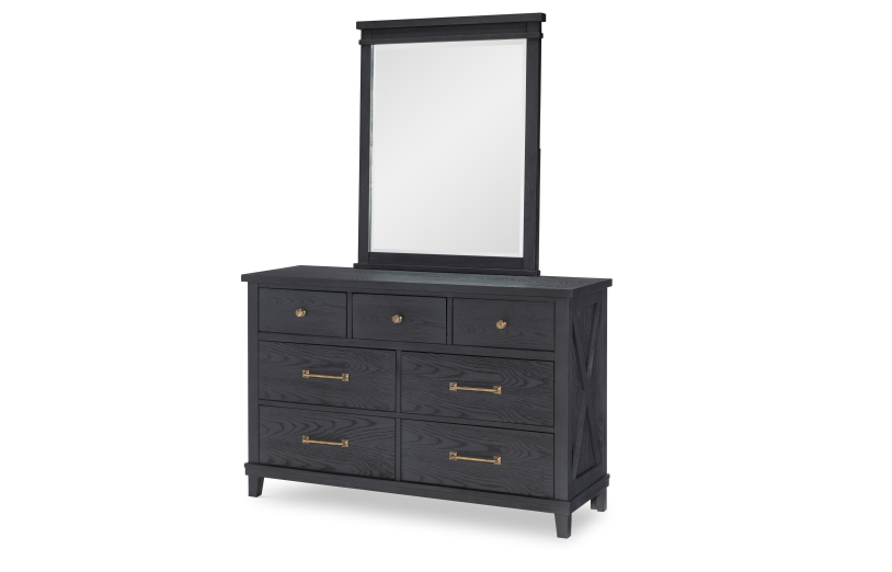 Rustic, comfortable, yet modern. Clean lines combine with natural textures and dark tones to create the Flatiron youth collection. Modern farmhouse designs such as block feet, flat drawer fronts, and X motifs on side panels offer a lot of details without feeling cluttered. The natural variations of the grain and rich Midnight finish offer a casual, livable style. Simple Aged Brass finished bar pull and knob hardware completes each piece.