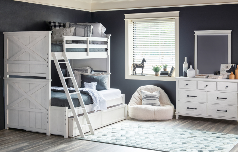 Rustic, comfortable, yet modern. Clean lines combine with natural textures and dark tones to create the Flatiron youth collection. Modern farmhouse designs such as block feet, flat drawer fronts, and X motifs on side panels offer a lot of details without feeling cluttered. The natural variations of the grain and rich Midnight finish offer a casual, livable style. Simple Aged Brass finished bar pull and knob hardware completes each piece.