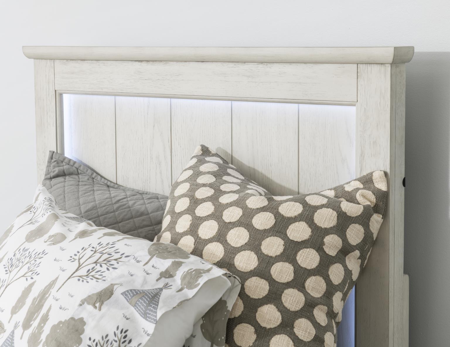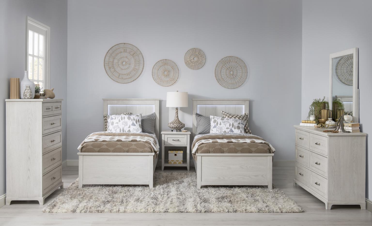 The Ashton youth collection is a unique blend of style elements that give a modern bohemian vibe. Details such as thick framed drawer fronts, shaped feet and plank details on beds all blend well. Features can be found through the group, such as touch lighting on beds and a cool bookcase headboard with shelf storage on the sides of the headboard. The Bleached Linen finish on White Oak veneers offers a subtly beautifully tone. Brushed Nickel hardware completes each piece.
