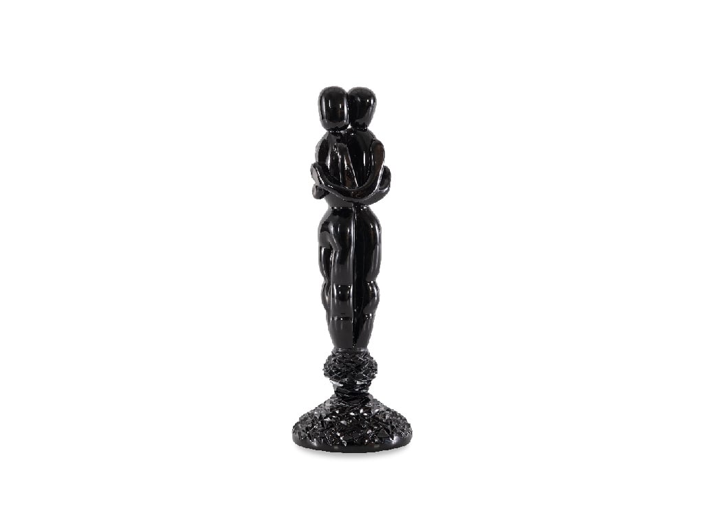 Polished black crystal sculpture of two figures in an embrace.