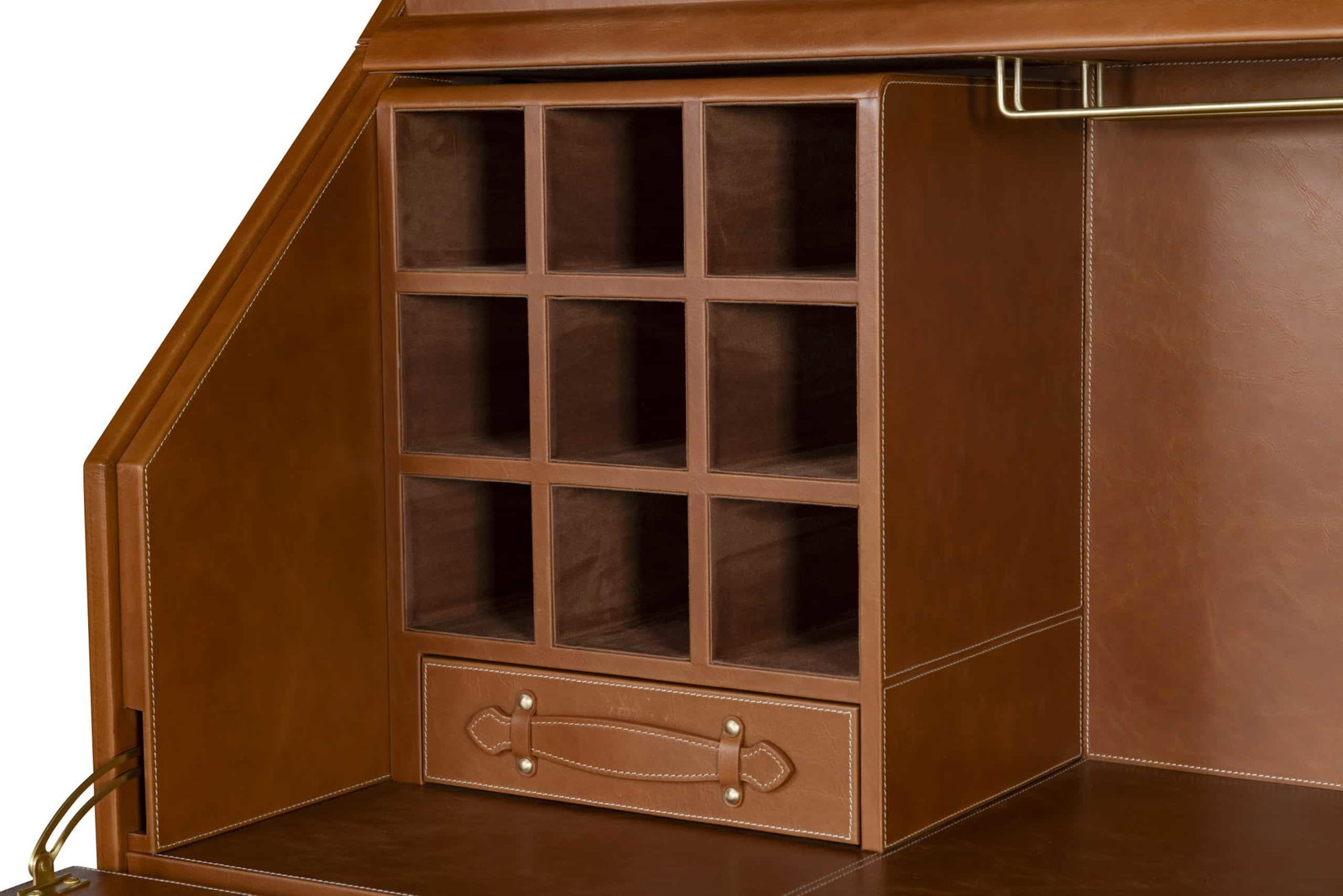 Product Description: Maitland Smith 8485-51 Ravenwood Bar Cabinet - Leather-wrapped campaign style bar cabinet sitting on an oil finished oak base. Fitted bar interior with brass accents, storage, and glassware solutions. Contrast stitching throughout. The cabinet can fold closed or remain open to display its interior details.