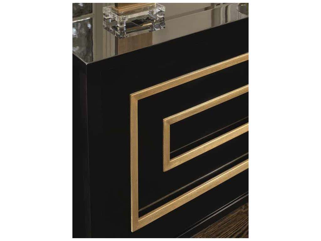Product Description: Maitland Smith 88-0210 Sovereign Lyric Credenza - Mahogany Wood credenza wrapped in Mahogany Veneer and topped in 5mm Black Tinted beveled glass. Finished in Caviar, this sleek credenza is outfitted in Cashmere Gold Stainless Steel ferules and trim. Front doors open to reveal two adjustable shelves.