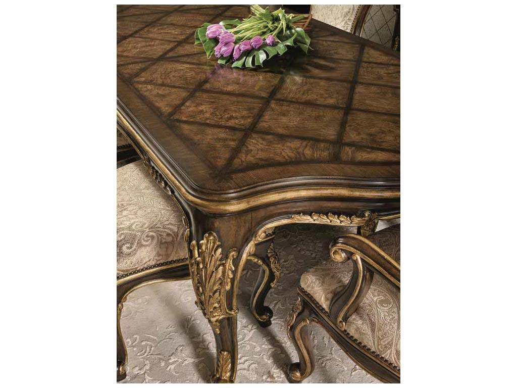 Product Description: Maitland Smith 88-0321 Sovereign Aria Dining Table - Solid Mahogany Wood table features an elegantly-woven parquet inlay top formed from Ash Burl, White Ash, and Walnut Veneers. Finished in Aria, this elaborate dining table boasts handmade carvings on the legs and rails, trimmed in gilded Aged Gold. Overall measurements include removable 25" table leaf.