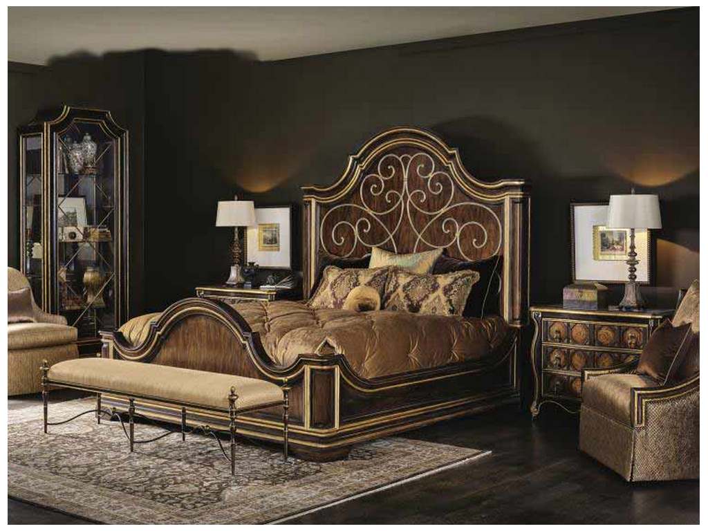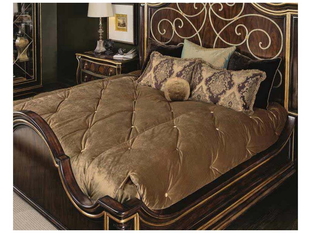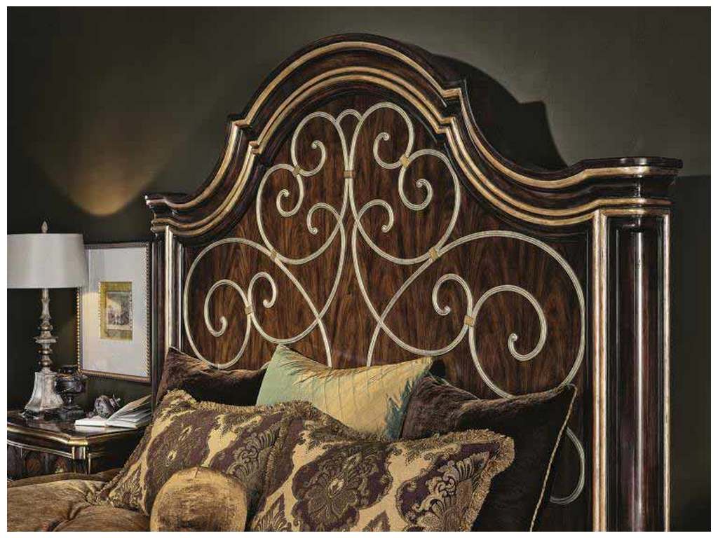 Product Description: Maitland Smith 88-0511 Sovereign Majorca King Panel Bed - Mahogany king bed makes a grand impression in Cathedral Alder Veneer and decorative metal scrolls. Havana finish with gilded Aged Venetian Gold trim and Burnished Silver details.