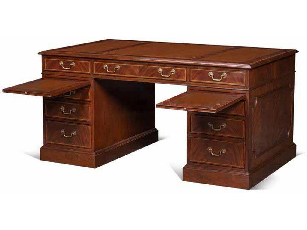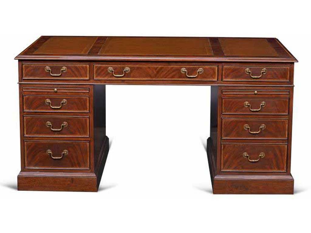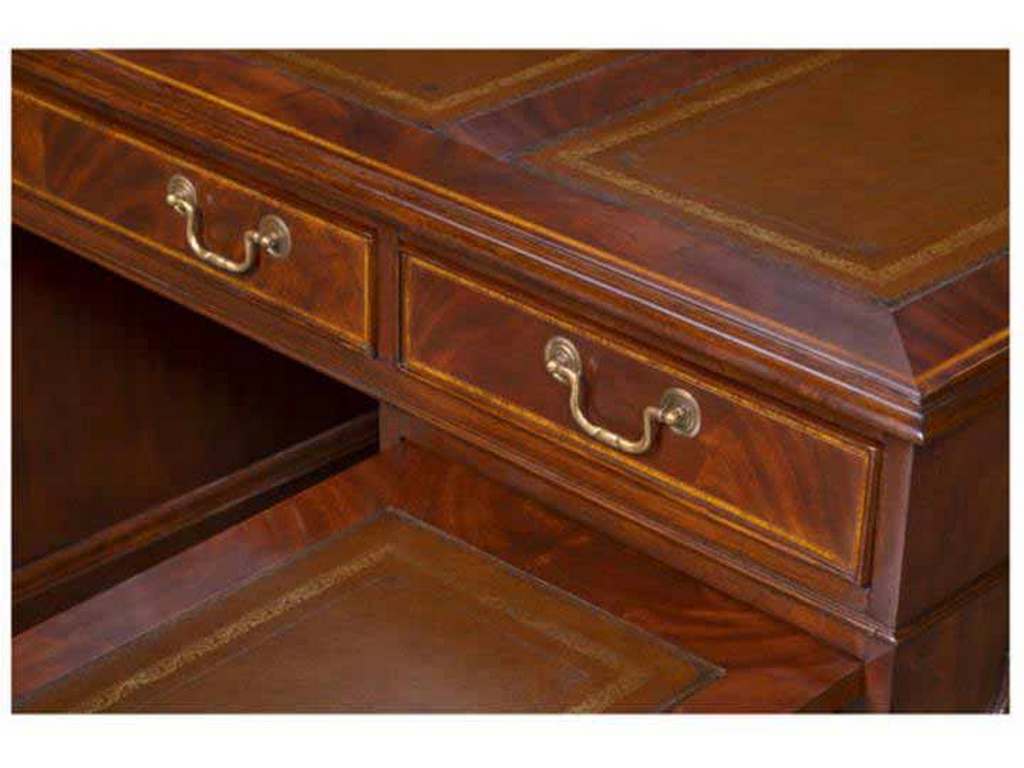 Product Description: Maitland Smith 89-0001 Scarborough House Roosevelt Desk - Crotch Mahogany writing desk with fine inlaid banding and Antique Brown Leather top, Brass hardware, and right side file drawer.