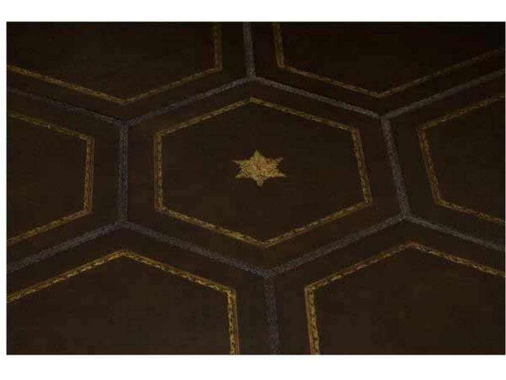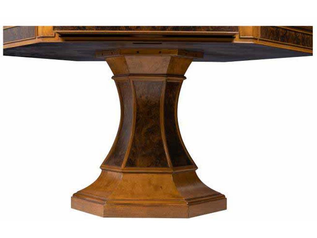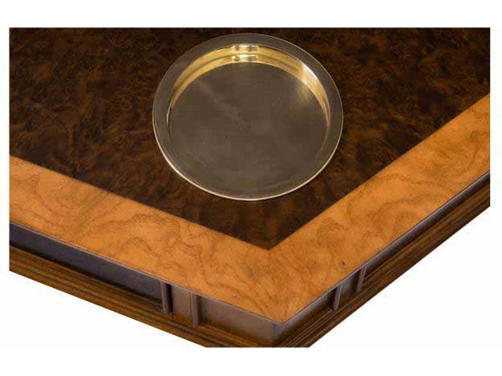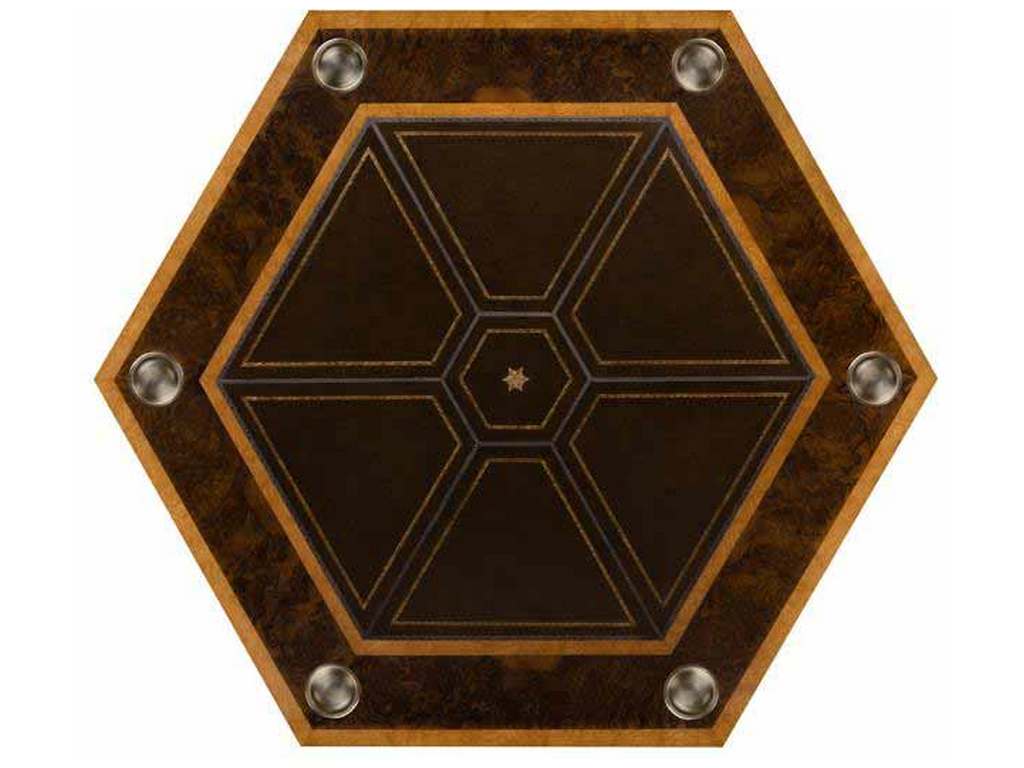 Product Description: Maitland Smith 89-0903 Scarborough House Blade Game Table - Combination Burl Walnut and Ash hexagonal game table with tooled leather and Brass accents, featuring drink holders and two working drawers.
