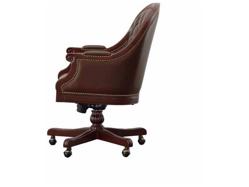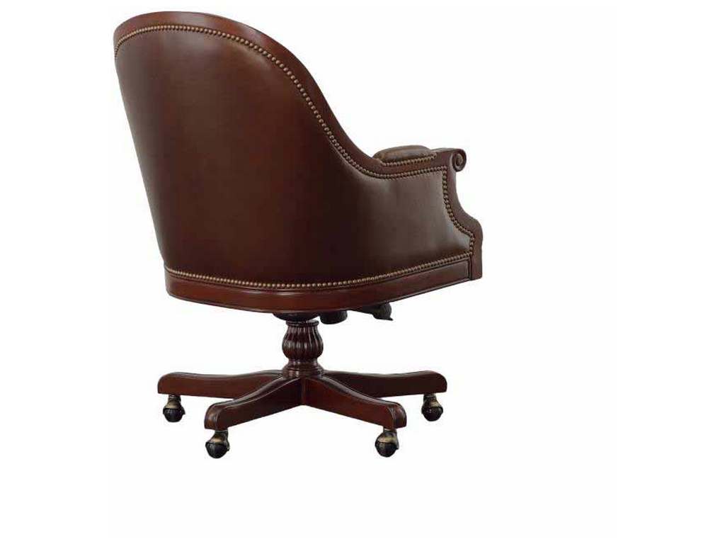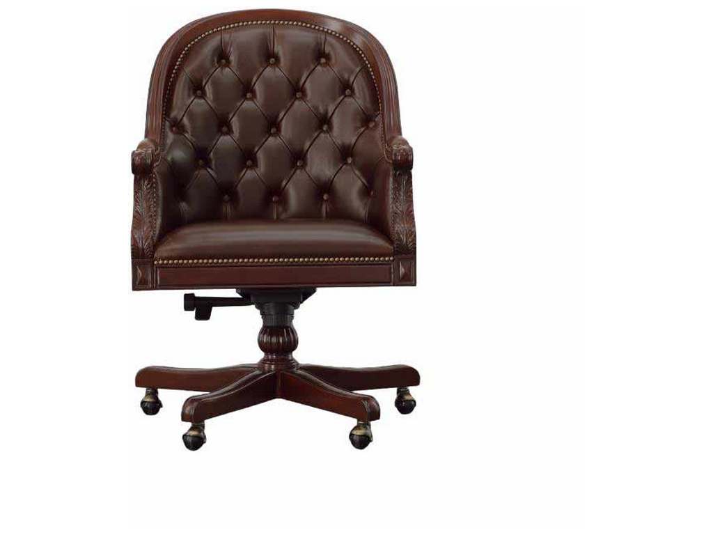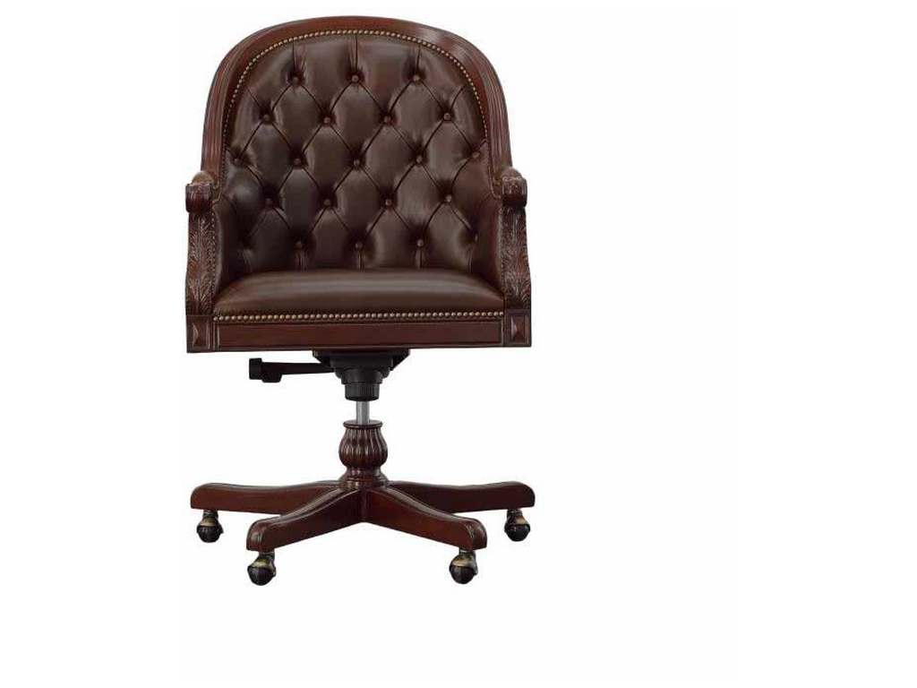 Product Description: Maitland Smith 89-1404 Scarborough House Marcio Desk Chair - Hand-carved Mahogany Swivel office desk chair with Tufted Dark Brown Italian Leather upholstery.