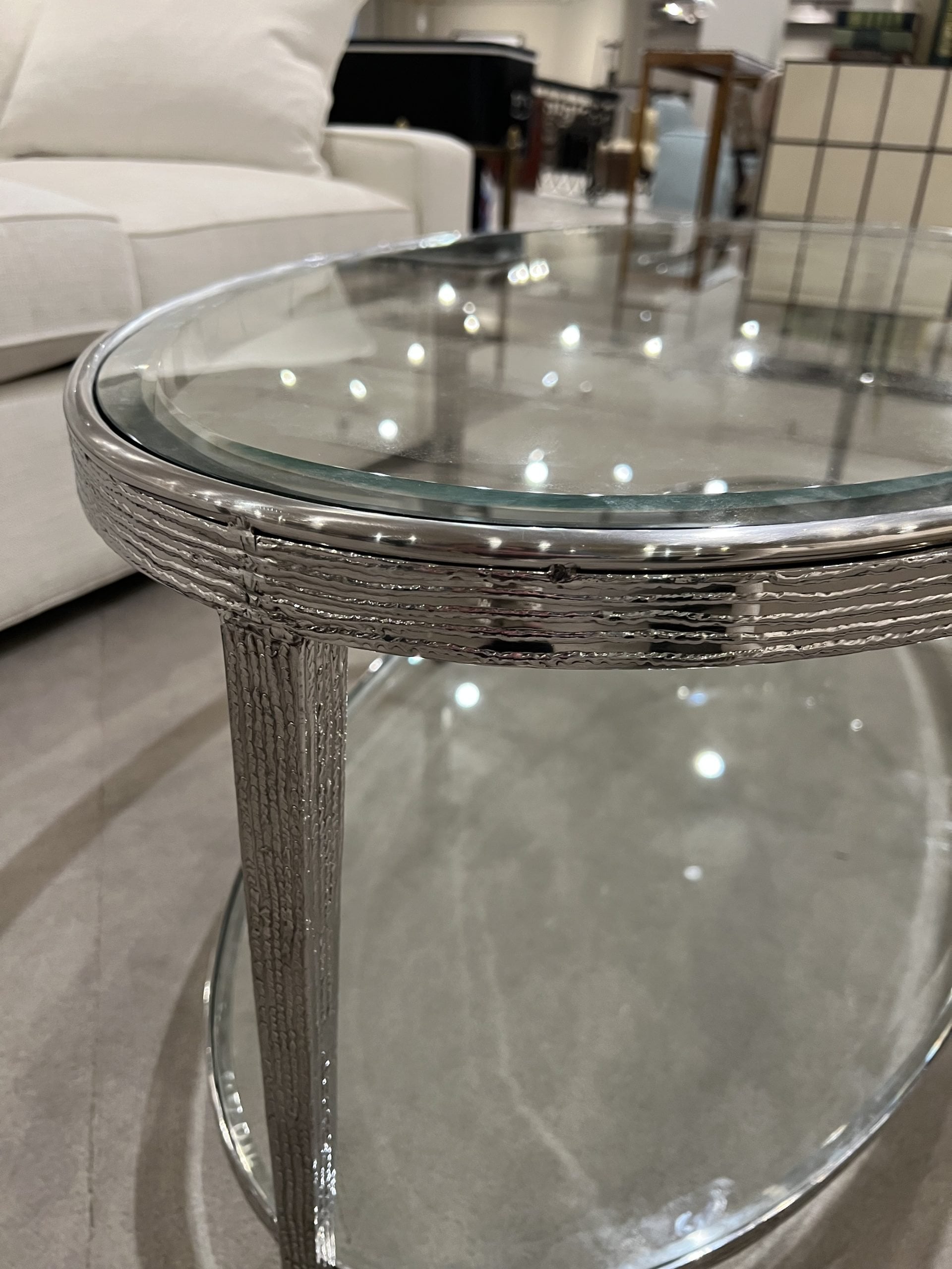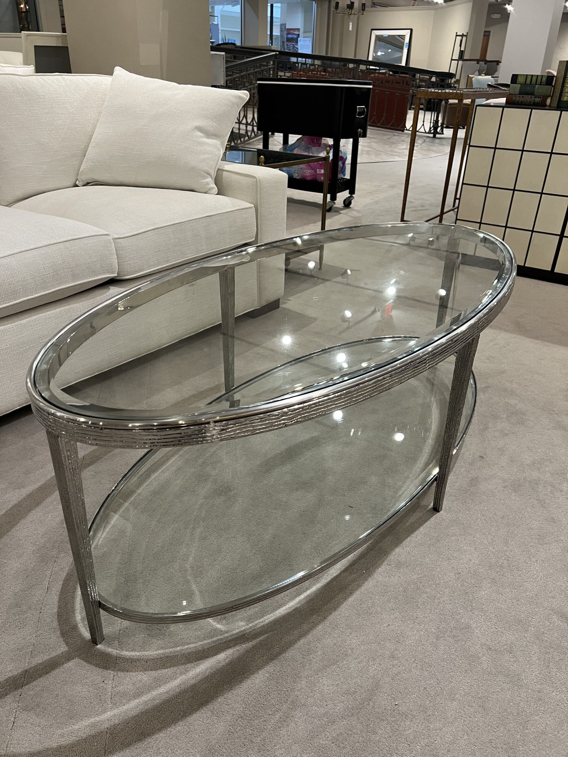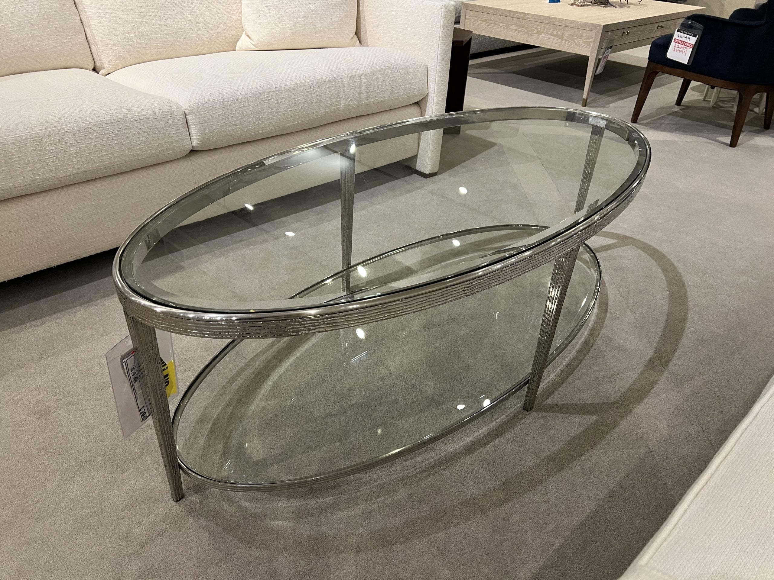 The Maitland-Smith Furniture Jinx Nickel Oval Cocktail Table (SKU: HM1016C/110) is available at Factory Outlets by Hickory Park in Hickory, North Carolina.
