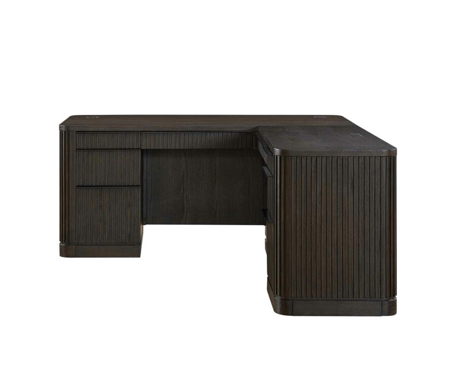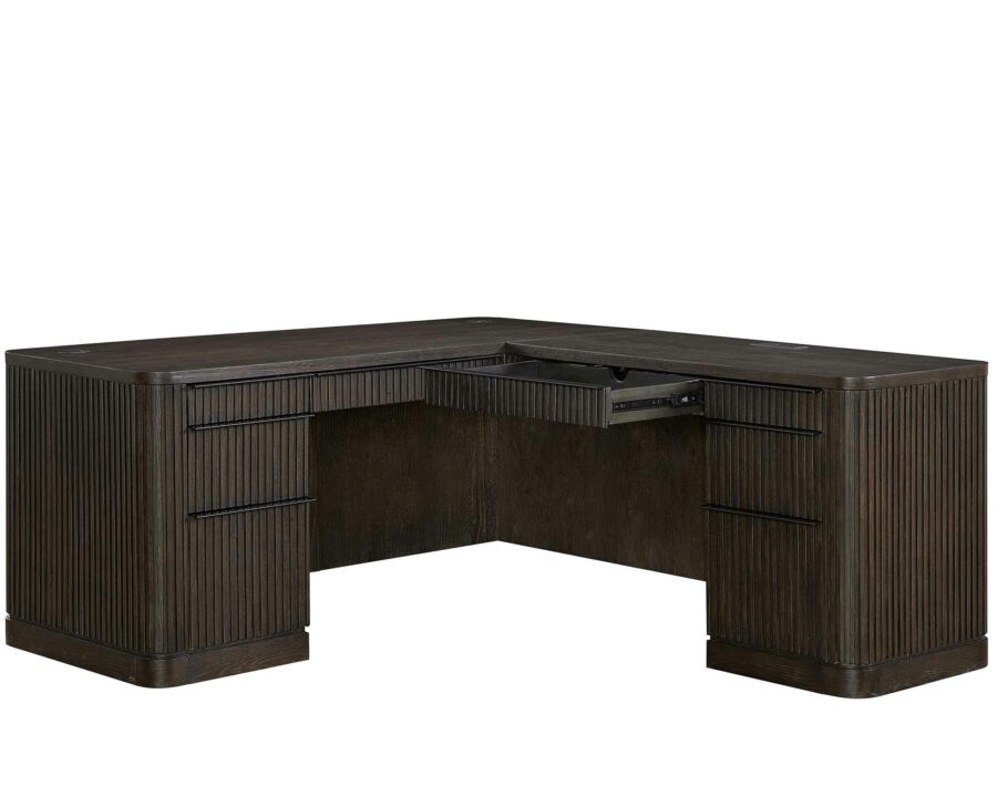 Product Description: Martin IMTU684R-KIT Pedestal L-Desk - A spacious L‑shaped home office desk from Martin Furniture’s Tulane Office Collection, designed to blend style and productivity. It features two drop‑down keyboard/pencil drawers, four utility storage drawers, and two locking file drawers to keep supplies organized and secure. Integrated wire‑management grommets help keep cords tidy, while a built‑in power center with USB and AC outlets makes it easy to plug in devices. Finished on all sides so it can be placed anywhere in a room, this desk combines practical storage and contemporary design to elevate any workspace.