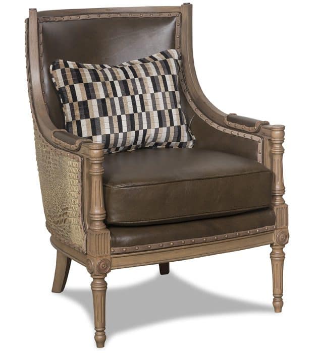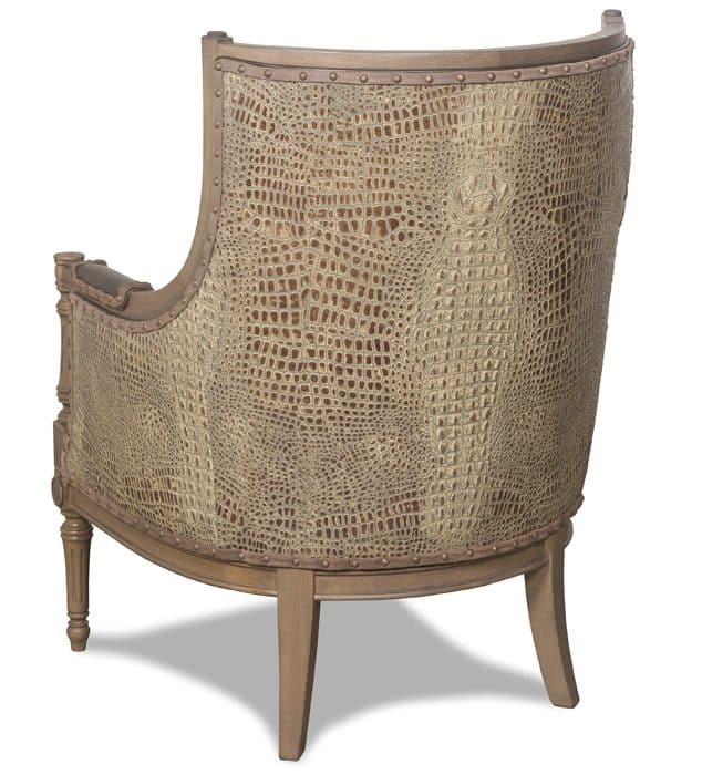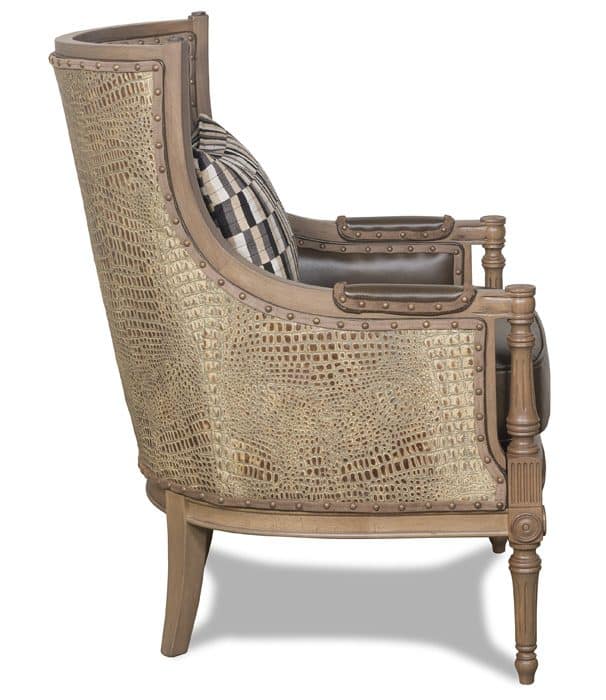Product Description: McKinley Leather 527-SLC Audrey Chair with Specialty Leather Combination - The Audrey is a modern sophistitcated classic with a simple shape yet magnificently carved wood trim. Audrey has an odd lot smooth leather on the inside and embossed crocodile on the back. A kidney pillow finishes the look with lively remnant of cut-velvet.