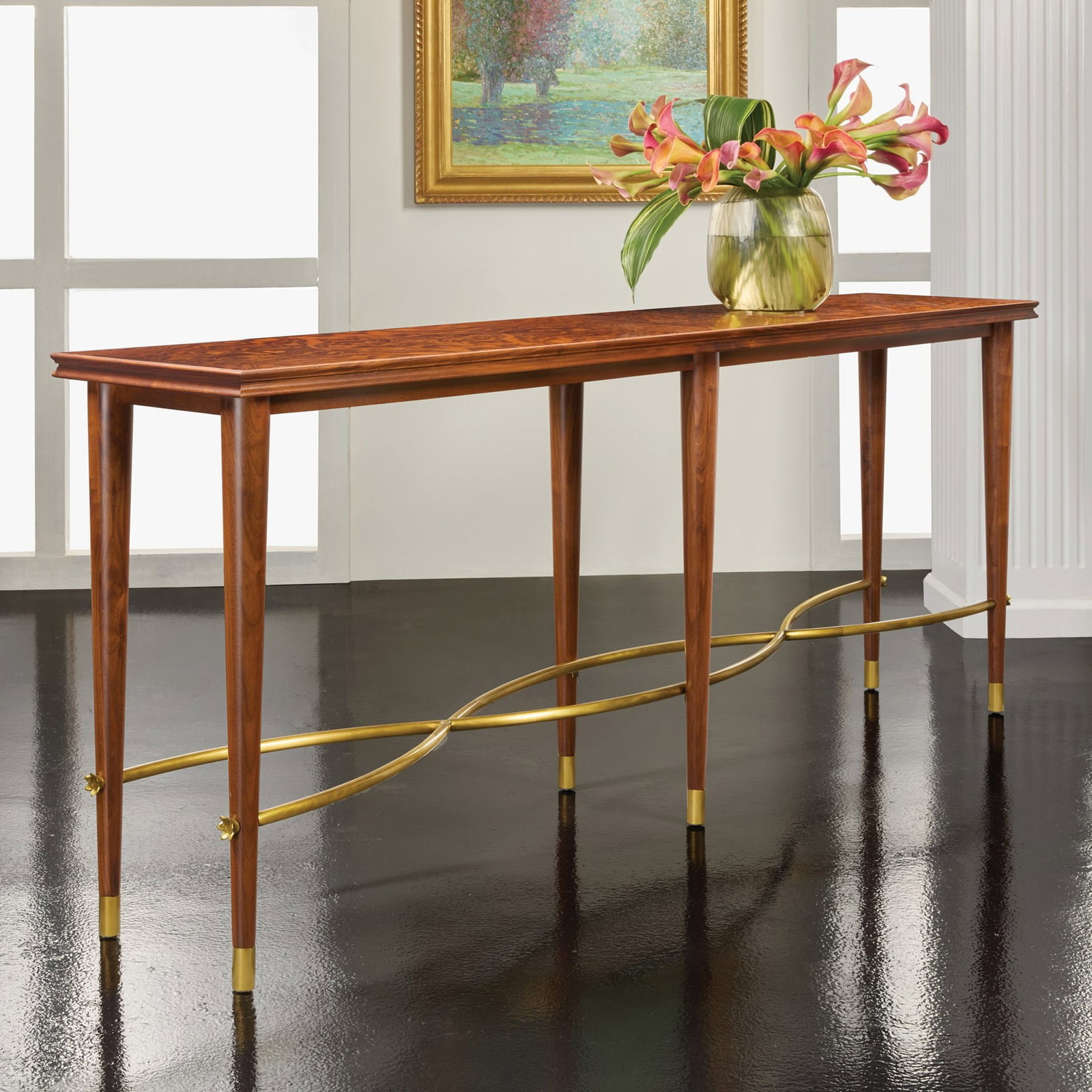 Product Description: Modern History MH1283F01 Marchand Console - A sophisticated, grand-scale statement piece that showcases the brand’s mastery of classic English veneer work. With its elongated silhouette and shallow depth, it is specifically designed to anchor large hallways, entryways, or the back of a grand-scale sofa.