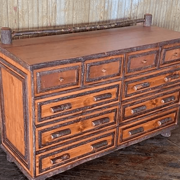 Product Description: Old Hickory OF160 Old Faithful Mule Chest - This eight drawer chest will provide for your storage needs in your bedroom, or any room in your home or cabin. Price and picture shown is for regular bark, rustic finish and oak veneer.