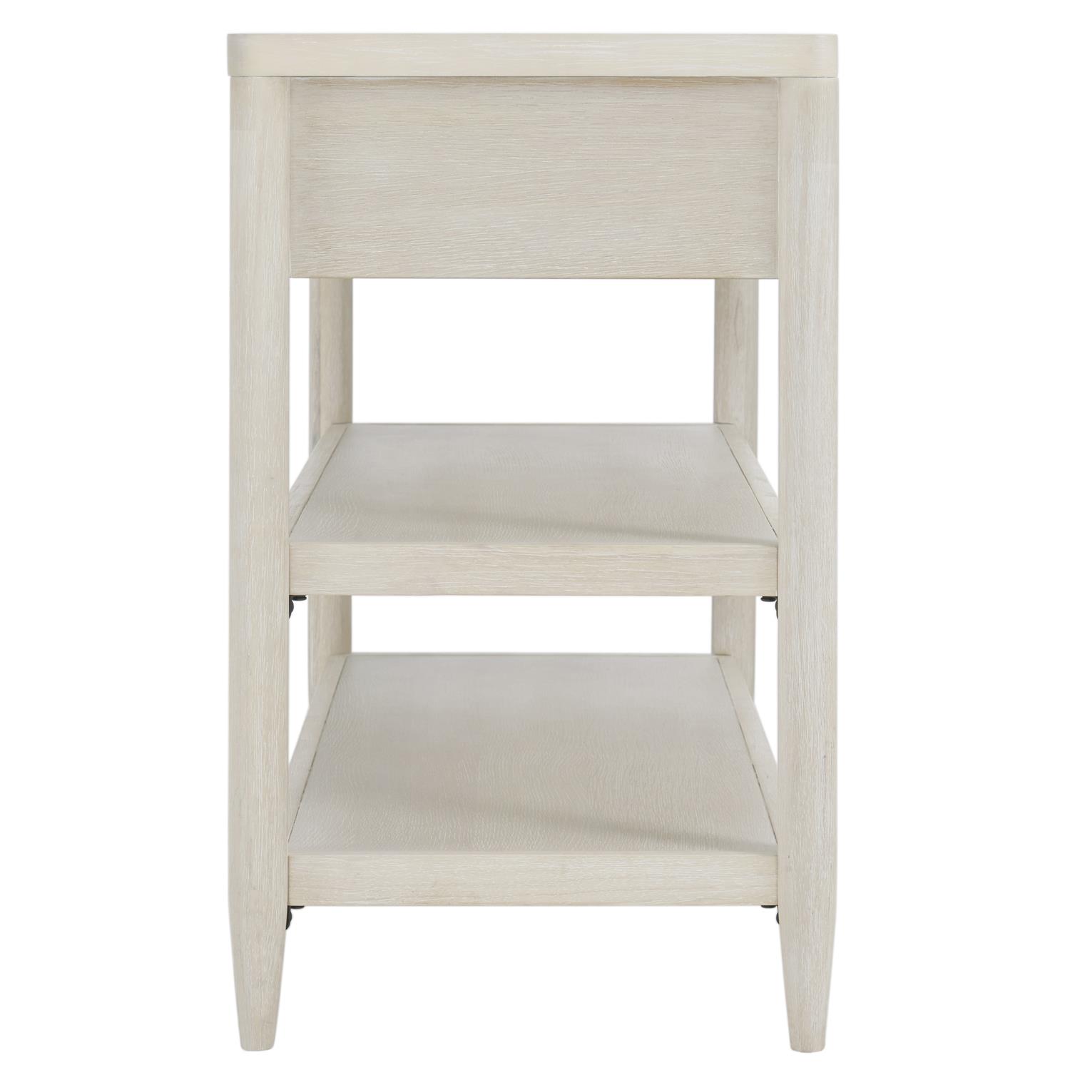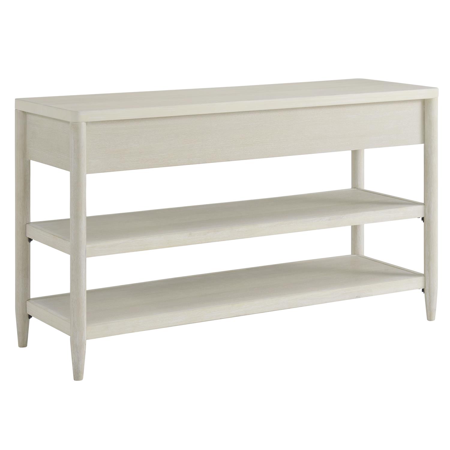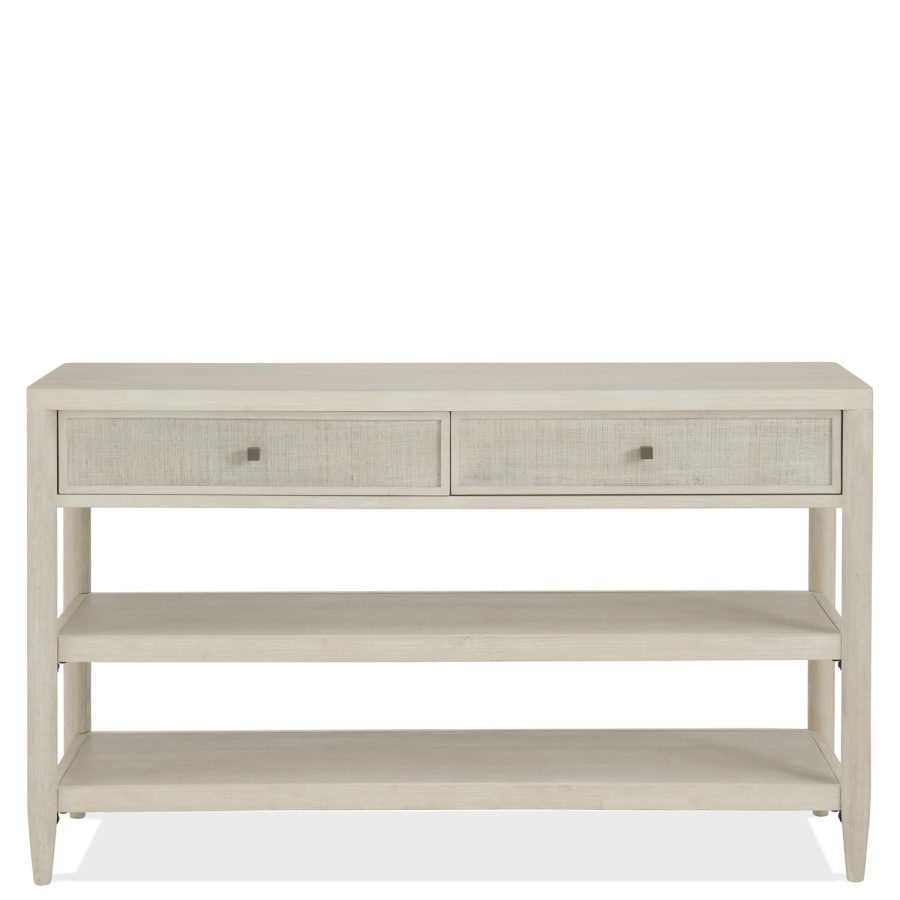 Product Description: Riverside Furniture 18215 Maren Sofa Table - Constructed of select hardwoods and Oak veneers. Elegant round tapered legs. Sea grass accents combined with the White Sands finish exudes modern coastal charm. Two drawers. Two display shelves. Ball bearing drawer guides.