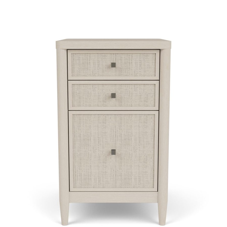 Product Description: Riverside Furniture 18234 Maren File Cabinet - Constructed of select hardwoods and Oak veneers. Sea grass accents combined with the White Sands finish exudes modern coastal charm. Two drawers constructed with dovetail joinery and ball-bearing extension guides. Bottom file drawer accepts letter or legal size files. Tip restraining hardware.