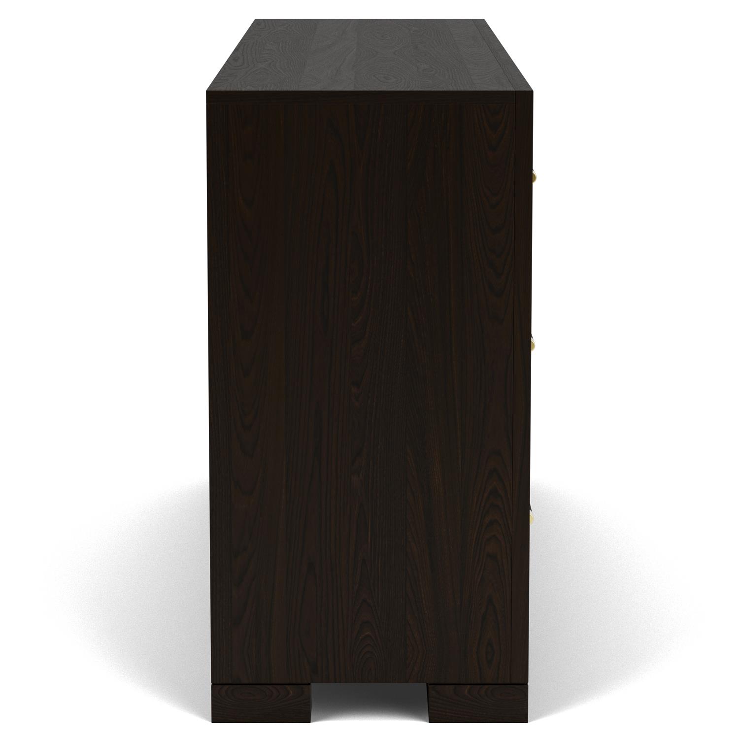 Lydia's sleek lines, complemented by rounded details, achieves a timeless modern contemporary style. The dark cabernet finish, combined with white fabrics, imparts a fresh and relaxed appearance. Linear hardware introduces visual interest, while maintaining an overall minimalistic aesthetic.