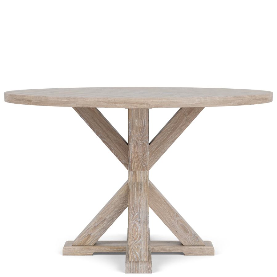 Product Description: Riverside Furniture 30752 Rosalie Round Dining Table - Constructed of select hardwoods and random match Oak veneer. The natural finish on the table compliments the white and natural materials in the collection. Trestle base with architectural pedestal and cross base make the table beautiful and yet functional. Random planked veneer on the top adds to the casual living look. Seats four people comfortably.