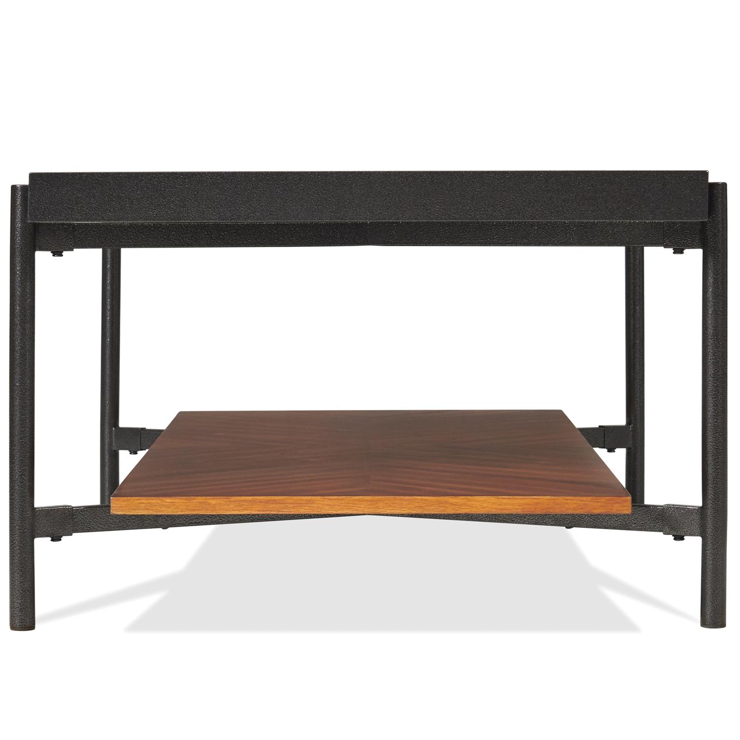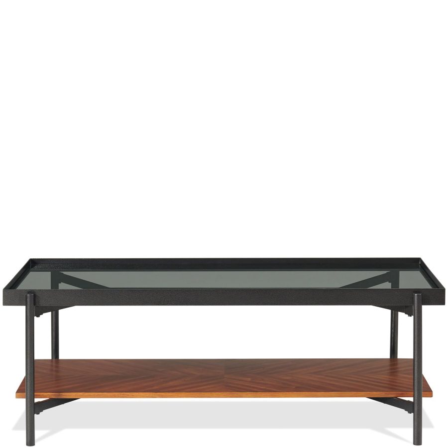 Product Description: Riverside Furniture 31502 Lennox Rectangular Coffee Table - Constructed of a Mindi veneer shelf, smoked black glass top, and metal legs/frame. The mix of materials give the table a casual yet modern feel. The fixed bottom shelf features a starburst veneer pattern. Accent "X" metal can be seen beneath the smoked black glass tops. A textured black metal forms the table legs and frame.