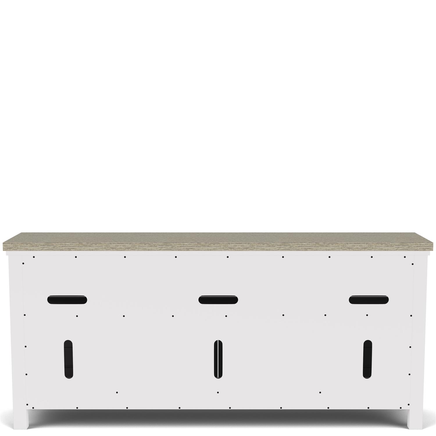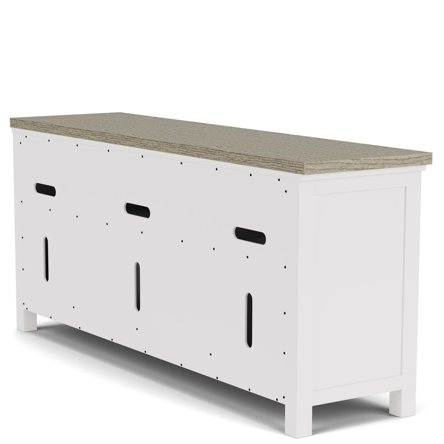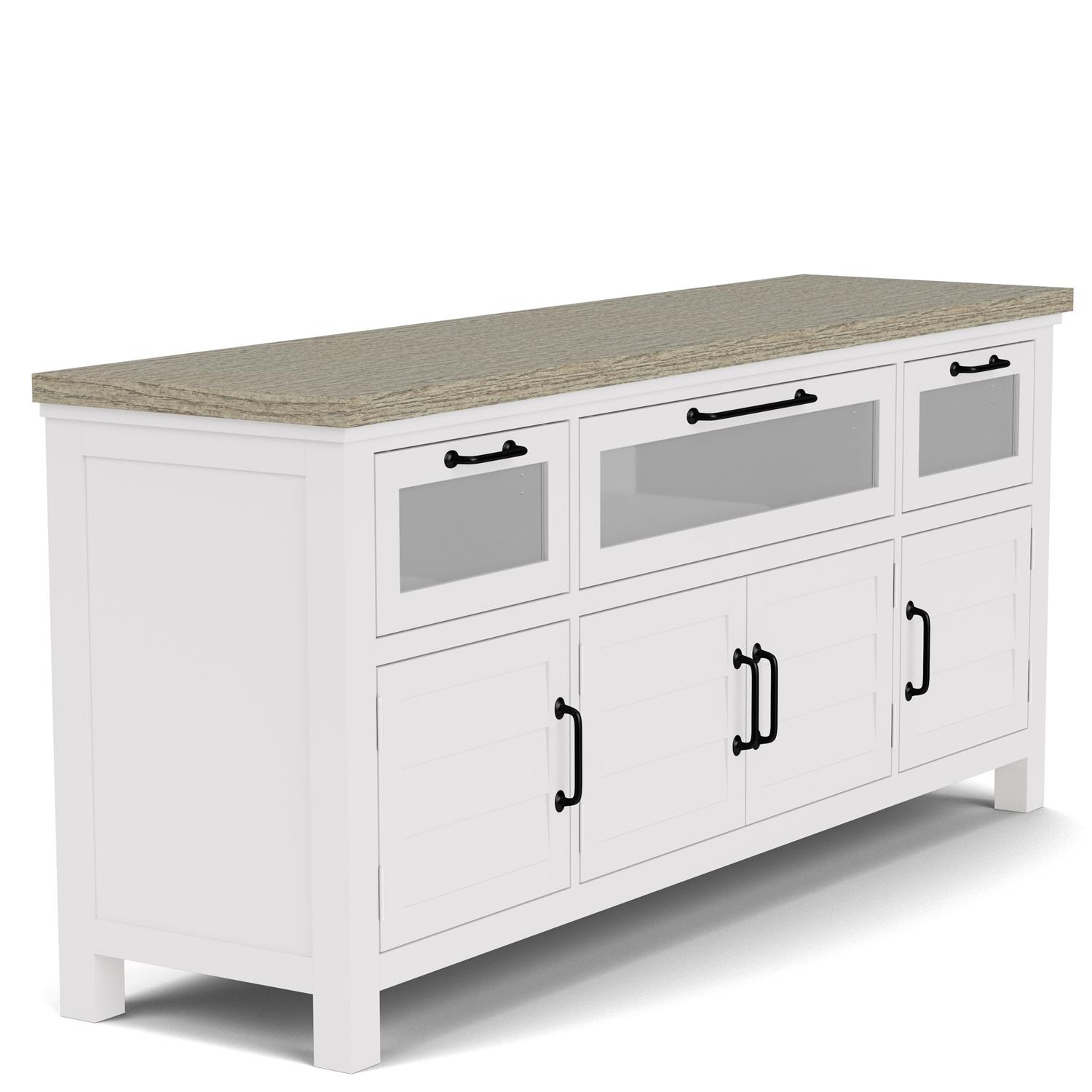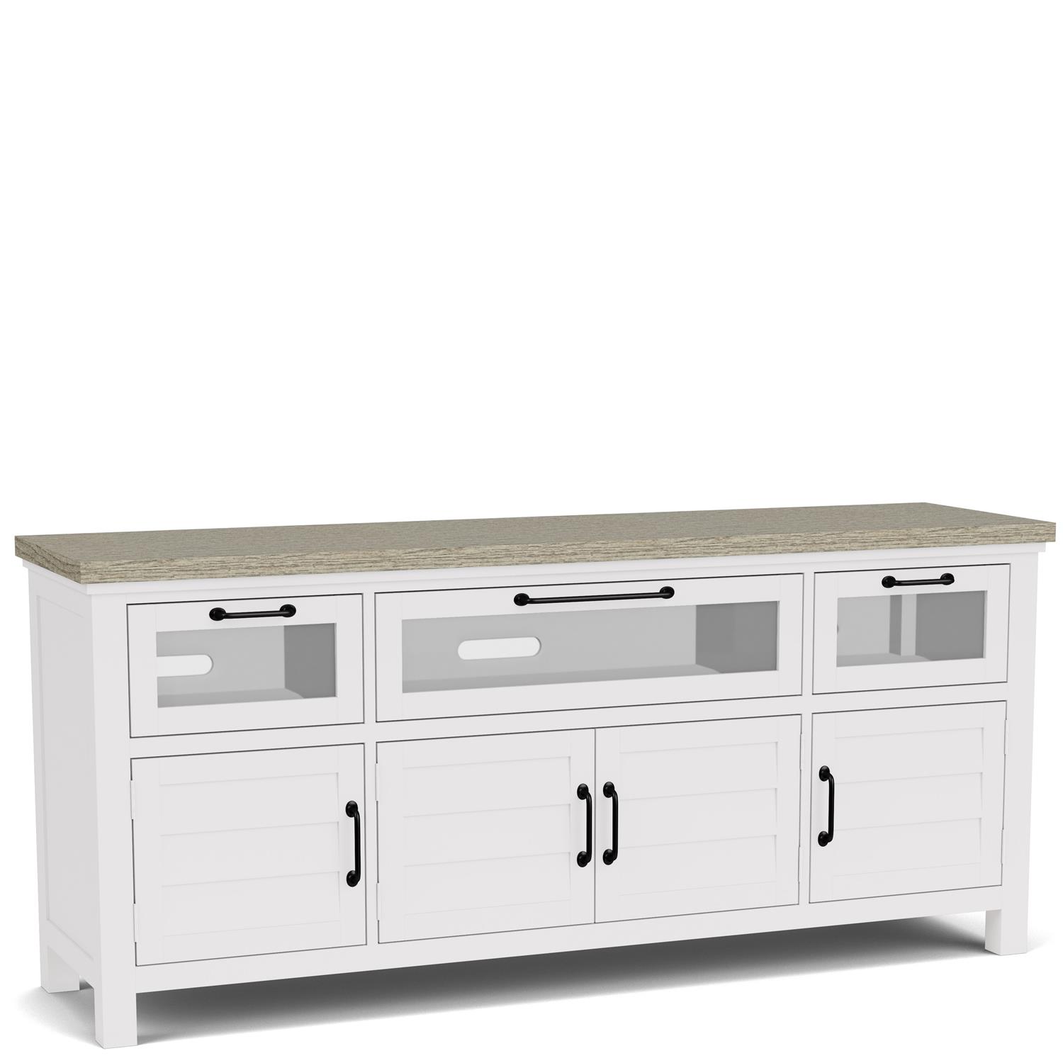 Product Description: Riverside Furniture 37240 Cora Entertainment Console - Constructed of select hardwoods and random matched Oak veneer. Soft grey top accents the beautiful white case. Framed doors and end panels. Case is elevated off the floor to give it a light airy appearance. Custom designed hardware. Board and batten design on doors with an adjustable shelf behind. Drop down glass front storage cubbies, with black and white medallion insert to add visual interest. Interior wiring access and ventilation cutouts. Tip restraining hardware.