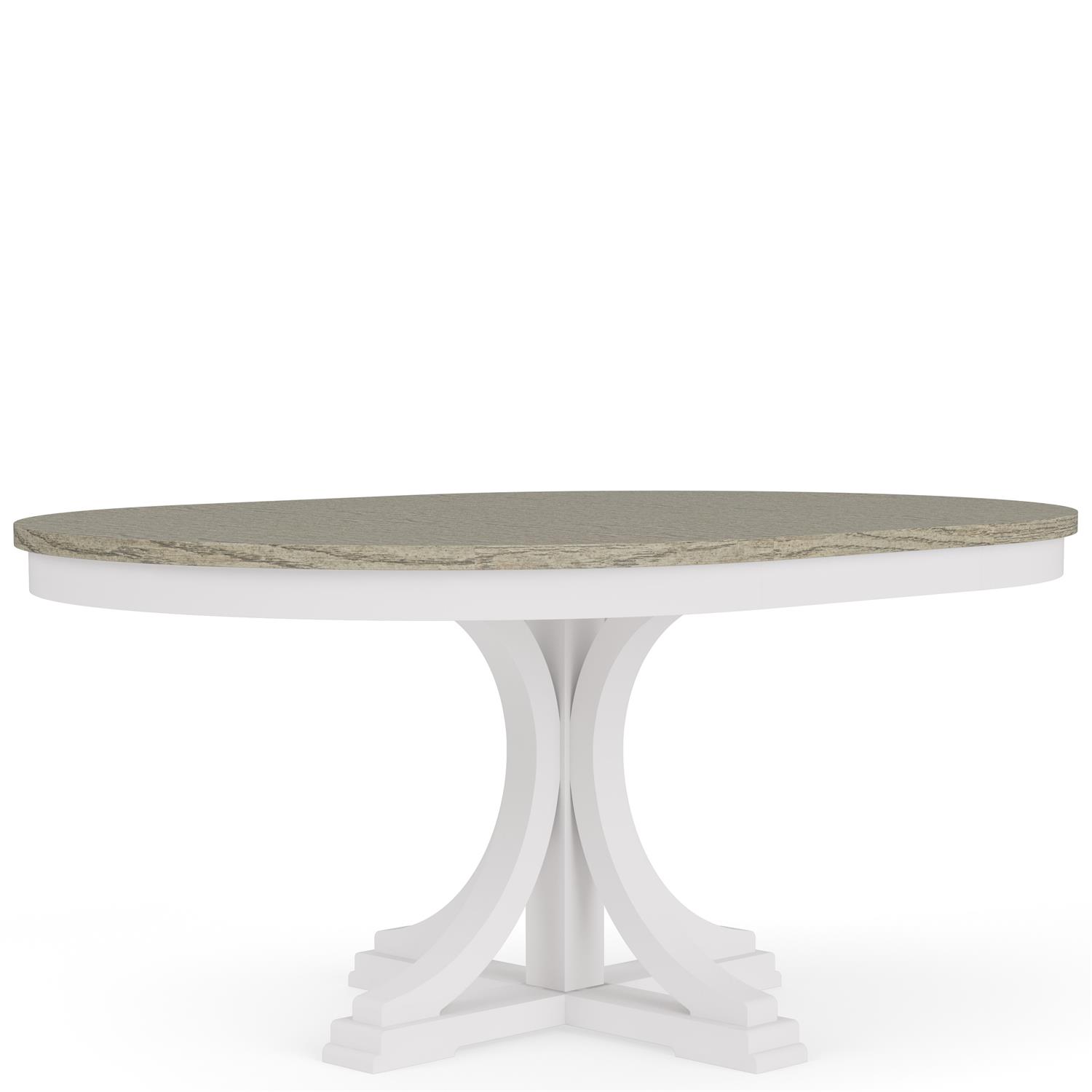 Product Description: Riverside Furniture 37251 - 37252 Cora Round Dining Table - Constructed of select hardwoods and random matched Oak veneers. Soft grey top accents the beautiful white case. Graceful arched pedestal with grand scaled base. 18" leaf. Top extends from 48" dia round to 66" oval when leaf is in use.