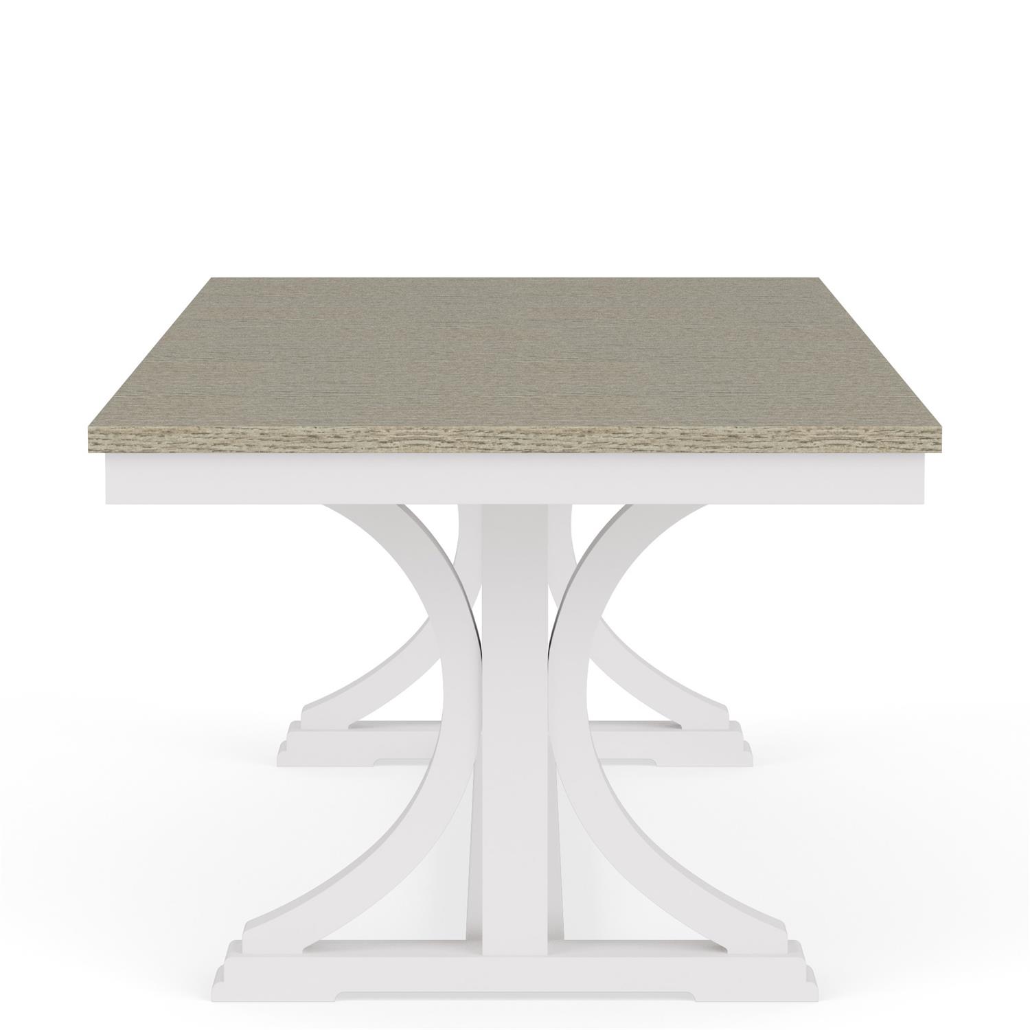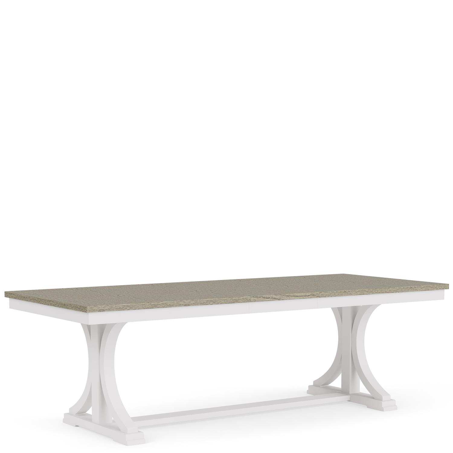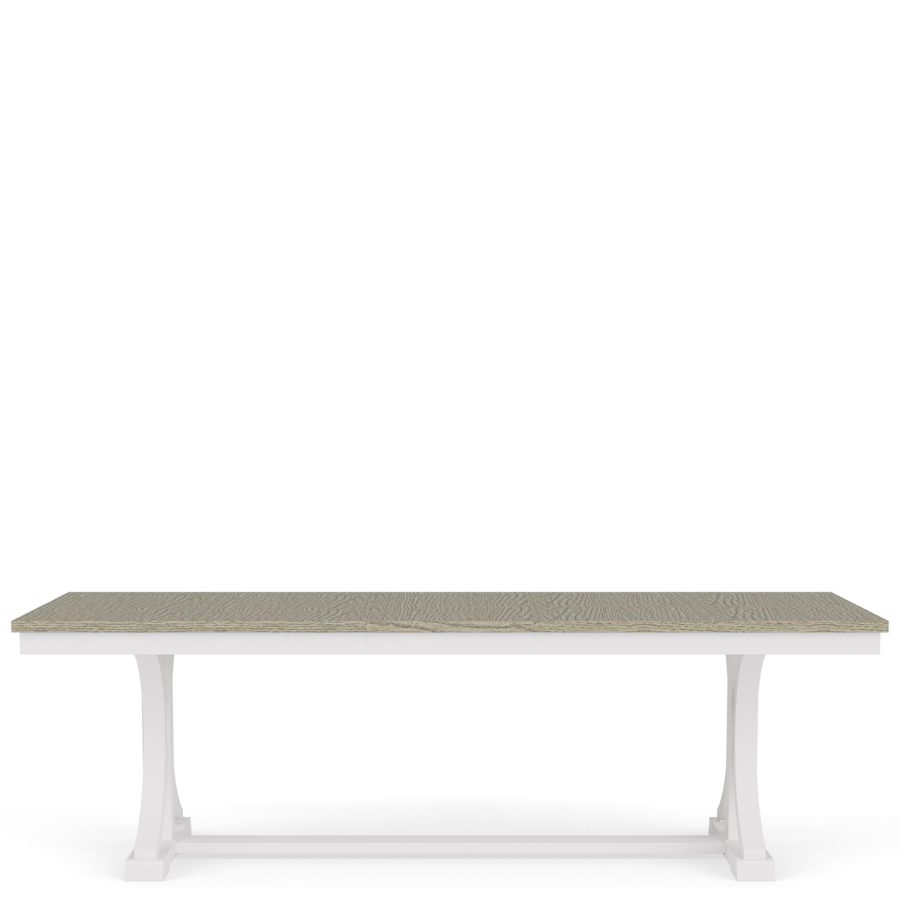 Product Description: Riverside Furniture 37253 Cora Trestle Dining Table - Constructed of select hardwoods and random matched Oak veneers. Soft grey top accents the beautiful white case. Graceful arched double pedestals with grand scaled stretcher. 18" leaf. Top extends from 76-94" x 40" when leaf is in use.