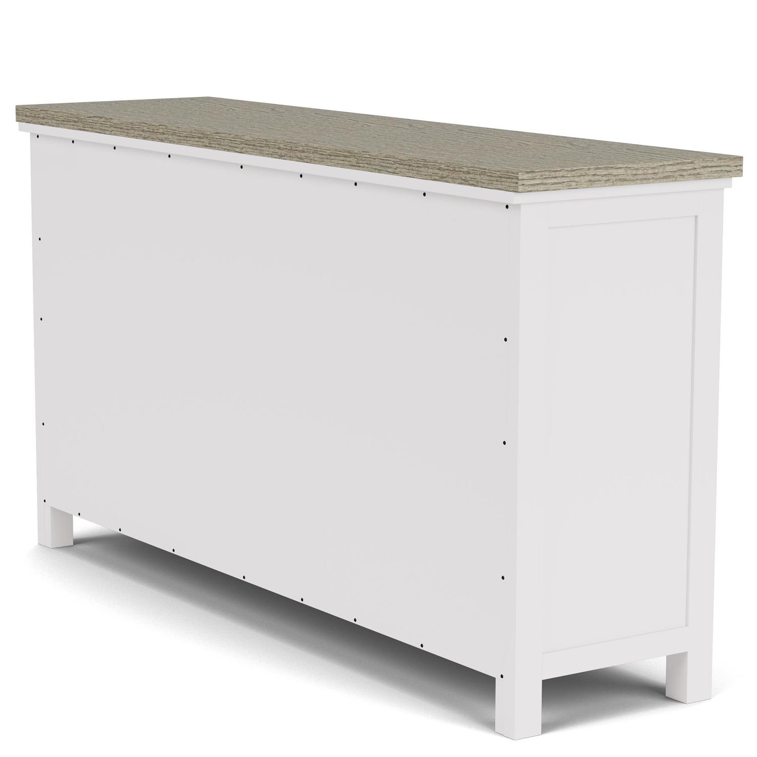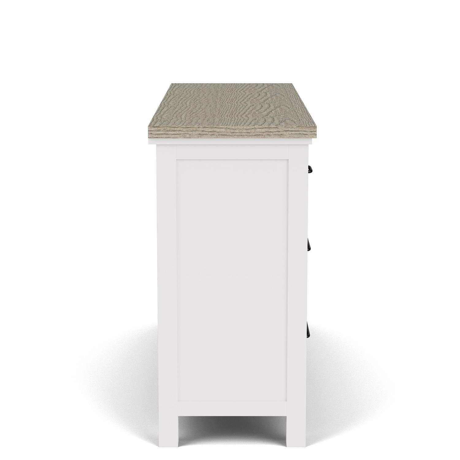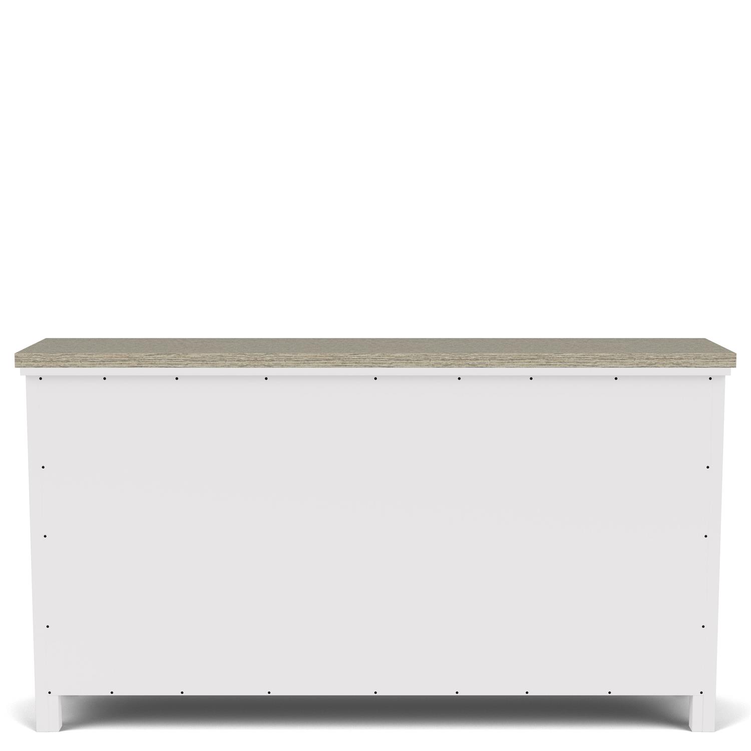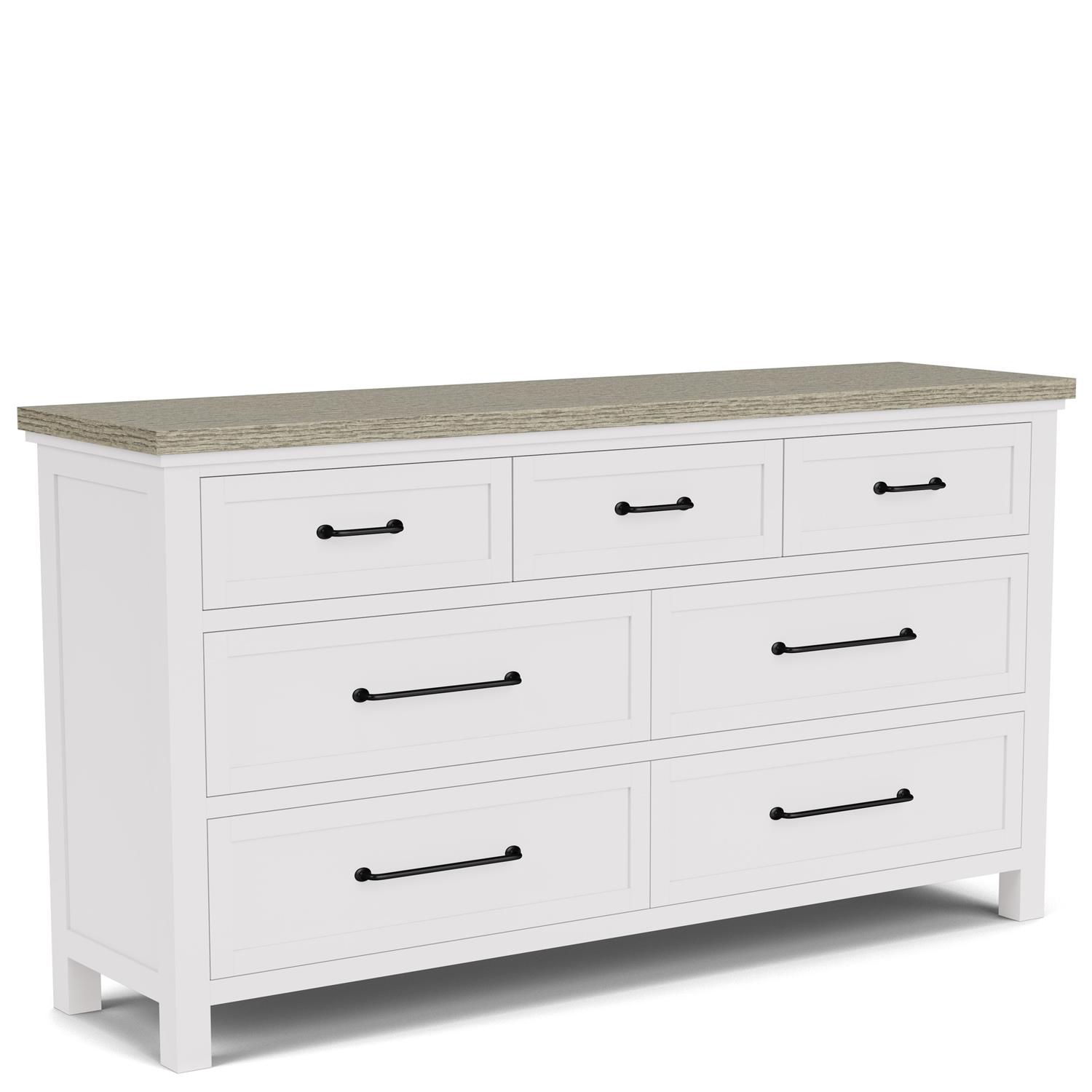 Product Description: Riverside Furniture 37290 Cora Seven Drawer Dresser - Constructed of select hardwoods and random matched Oak veneers. Soft grey top accents the beautiful white case. Framed drawers and end panels. Case is elevated off the floor to give it a light airy appearance. Custom designed hardware. Patterned drawer bottoms. All drawers are constructed with dovetail joinery and ball-bearing extension guides; Cedar veneer in bottom drawers; Dust panel under bottom drawers. Tip restraining hardware.