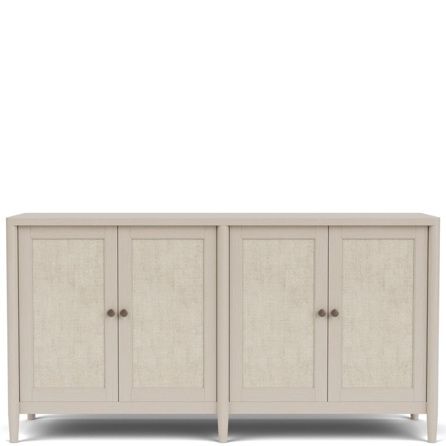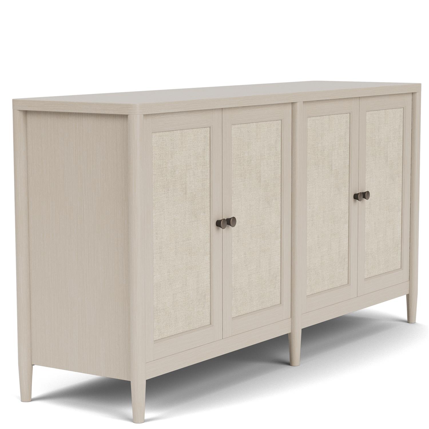 Product Description: Riverside Furniture 37556 Laguna Server - Constructed of select hardwoods and random oak veneer. Four individually framed doors with woven natural material. Custom designed hardware in an aged bronze finish. Multistep blonde finish for a casual vibe. Sleek full round tapered legs. Two silverware tray drawers and two adjustable shelves behind doors. 5" from bottom of case to floor.