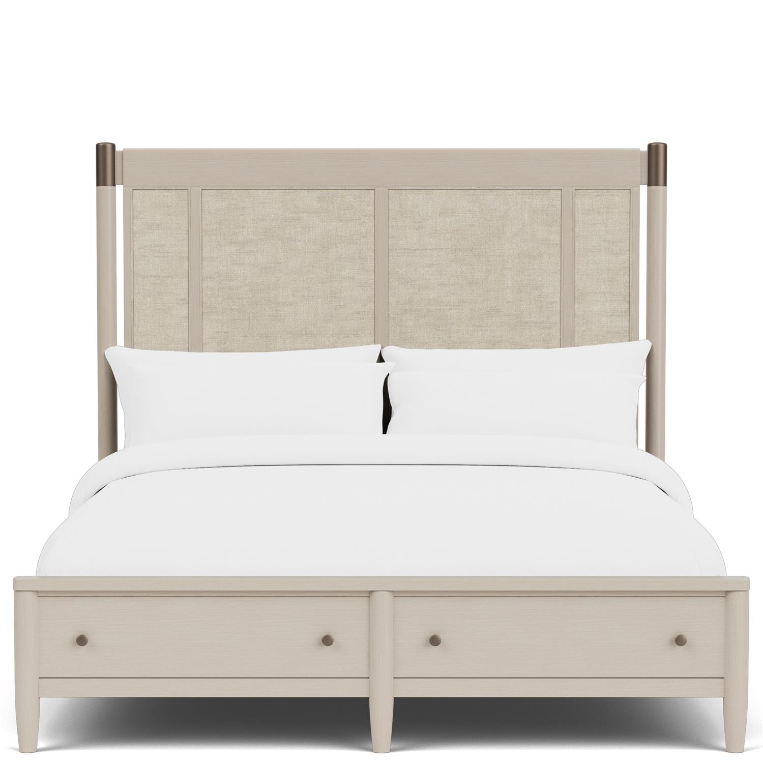 Product Description: Riverside Furniture 3780-37583-37576 Laguna King Storage Bed - Constructed of select hardwoods and oak veneer. Natural woven material on headboard, metal finial on headboard posts. Custom designed hardware in an aged bronze finish. Multistep blonde finish for a casual vibe. Sleek full round tapered posts.