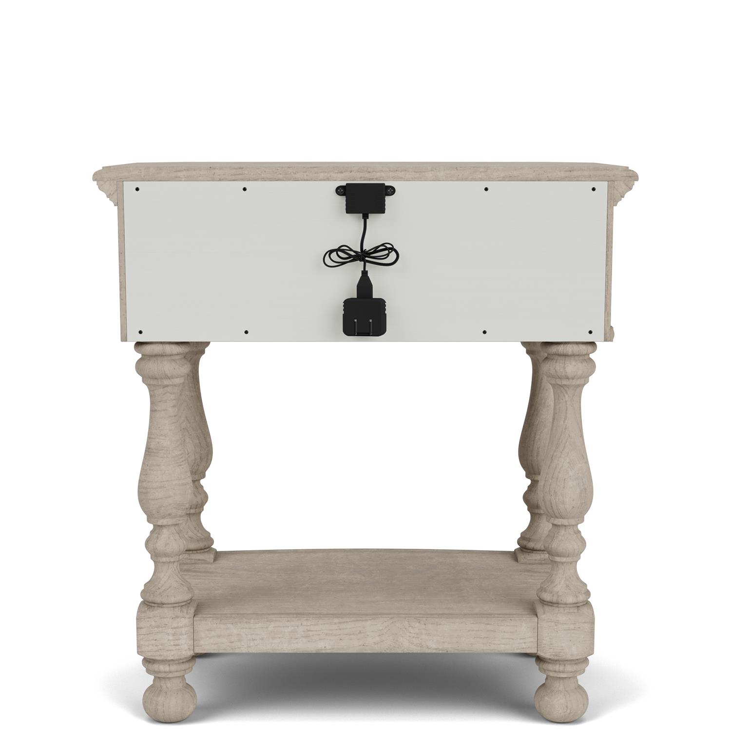 Product Description: Riverside Furniture 44268 Kensington One Drawer Nightstand - Constructed of select hardwoods and random matched oak veneer. Curved drawer front with decorative overlay molding. Custom designed hardware with coordinating painted finish. Chamfered corners with decorative overlay panels. Drawer constructed with dovetail joinery and ball-bearing extension guides. Veneer drawer bottoms. Open shelf for easy storage or display. Dual USB power outlet mounted on back.