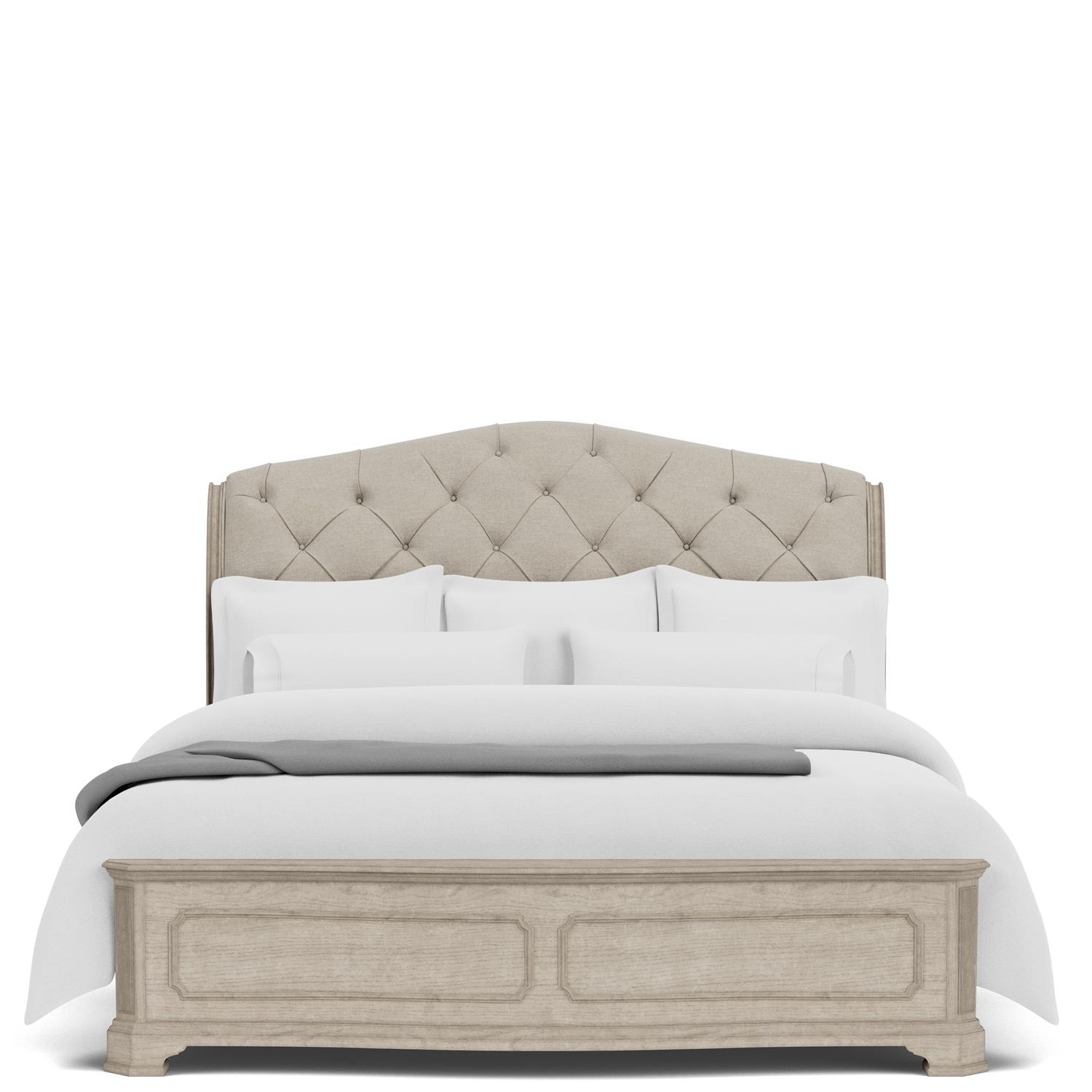 Product Description: Riverside Furniture 44284-44285-44276 Kensington King Sleigh Bed - Constructed of select hardwoods and random matched oak veneer. Multi-step vintage linen finish with light wire brushing. Plush button tufted headboard with hand folded diamond pattern. Grand scaled scrolled posts. Graceful arched top.