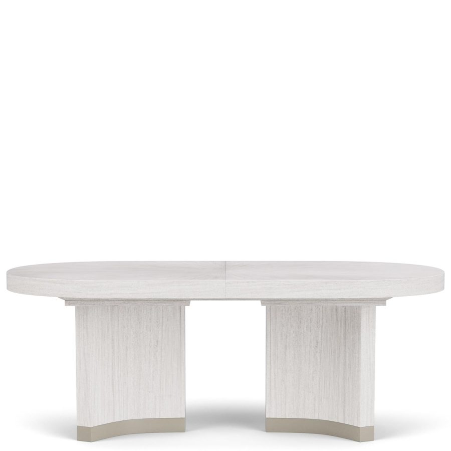 Product Description: Riverside Furniture 82550 Hepburn Oval Dining Table - Beautiful sunburst veneer pattern radiates out into the room. Double pedestal bases have three concave sides forming a unique shape. Faux metal accent trim on the base. 80" x 44" top extends to 100" x 44" with one 20" leaf inserted.