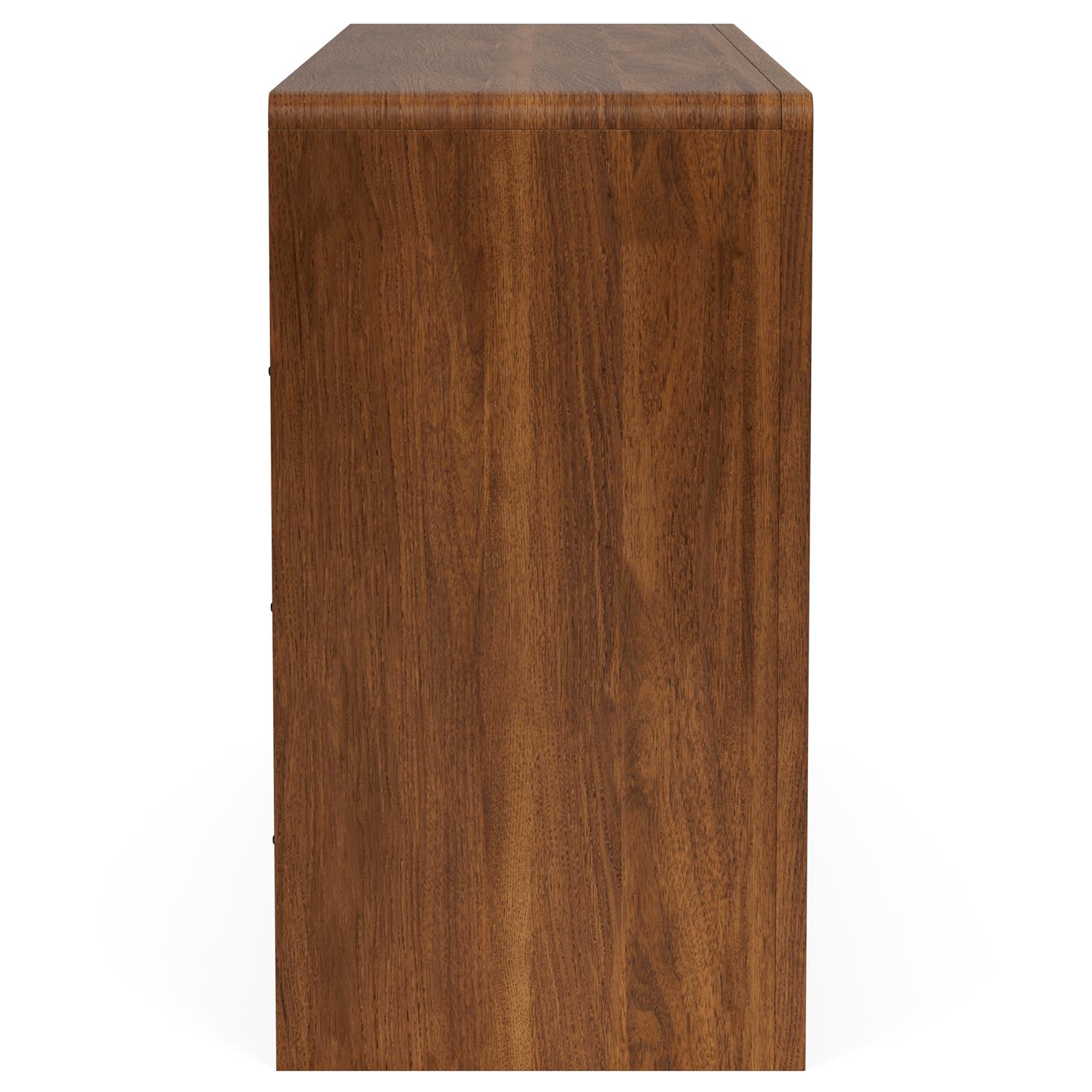 Product Description: Riverside Furniture 83760 Elsie Six Drawer Dresser - Constructed of select hardwood solids and random matched walnut veneer. Rounded top panel gives the classic form a modern twist. Front frame follows the smooth radiused top. Combination of wood and metal give you a one-of-a-kind custom designed hardware. Recessed drawers give dimension to the case. Six drawers are constructed with dovetail joinery and ball-bearing extension guides. Top drawers have felt-lined bottoms, Bottom drawers have Cedar veneer bottoms, All other drawers have veneered bottoms. Dust panel under bottom drawers.
