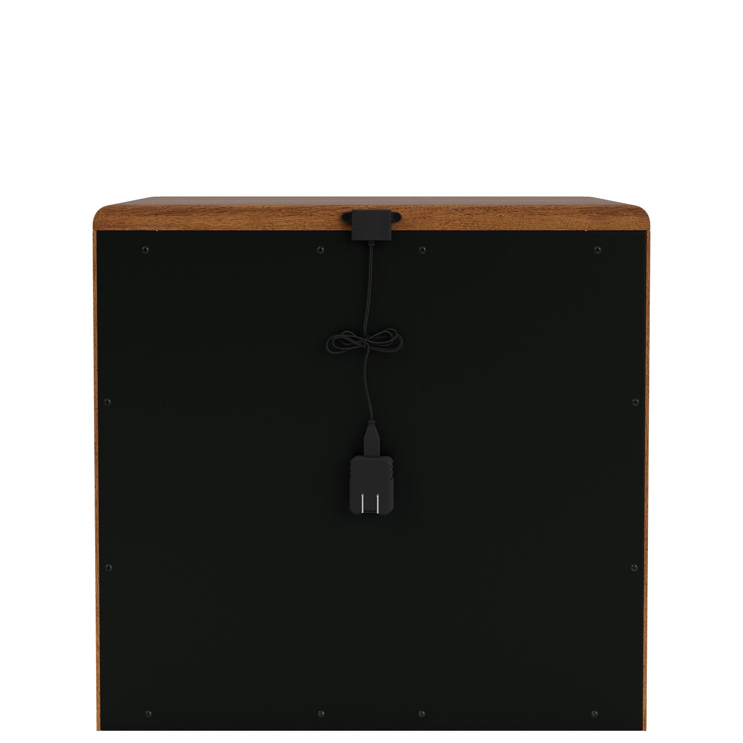Product Description: Riverside Furniture 83768 Elsie Two Drawer Nightstand - Constructed of select hardwood solids and random matched walnut veneer. Rounded edges on the top gives the case a unique look. Front frame molding with subtle cove is rounded in the corners to follow the shape of the top panel. Custom designed linear hardware with wood bar and plated metal keepers. Two drawers are constructed with dovetail joinery and ball-bearing extension guides. Drawers have veneered bottoms. Dust panel under bottom drawers. Dual USB power outlet mounted on the back.