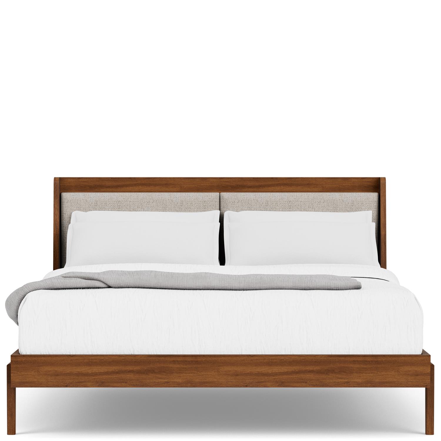 Product Description: Riverside Furniture 83784-83785 Elsie King Platform Bed - Constructed of select hardwood solids and random matched Walnut veneers. Sleek low profile headboard. Two plush upholstered panels for extra comfort. Unique taper legs are integrated into the rails. Includes wood support slats for bedding and wood support leg(s) with a built-in leveler attached to each slat. No boxspring/foundation required.