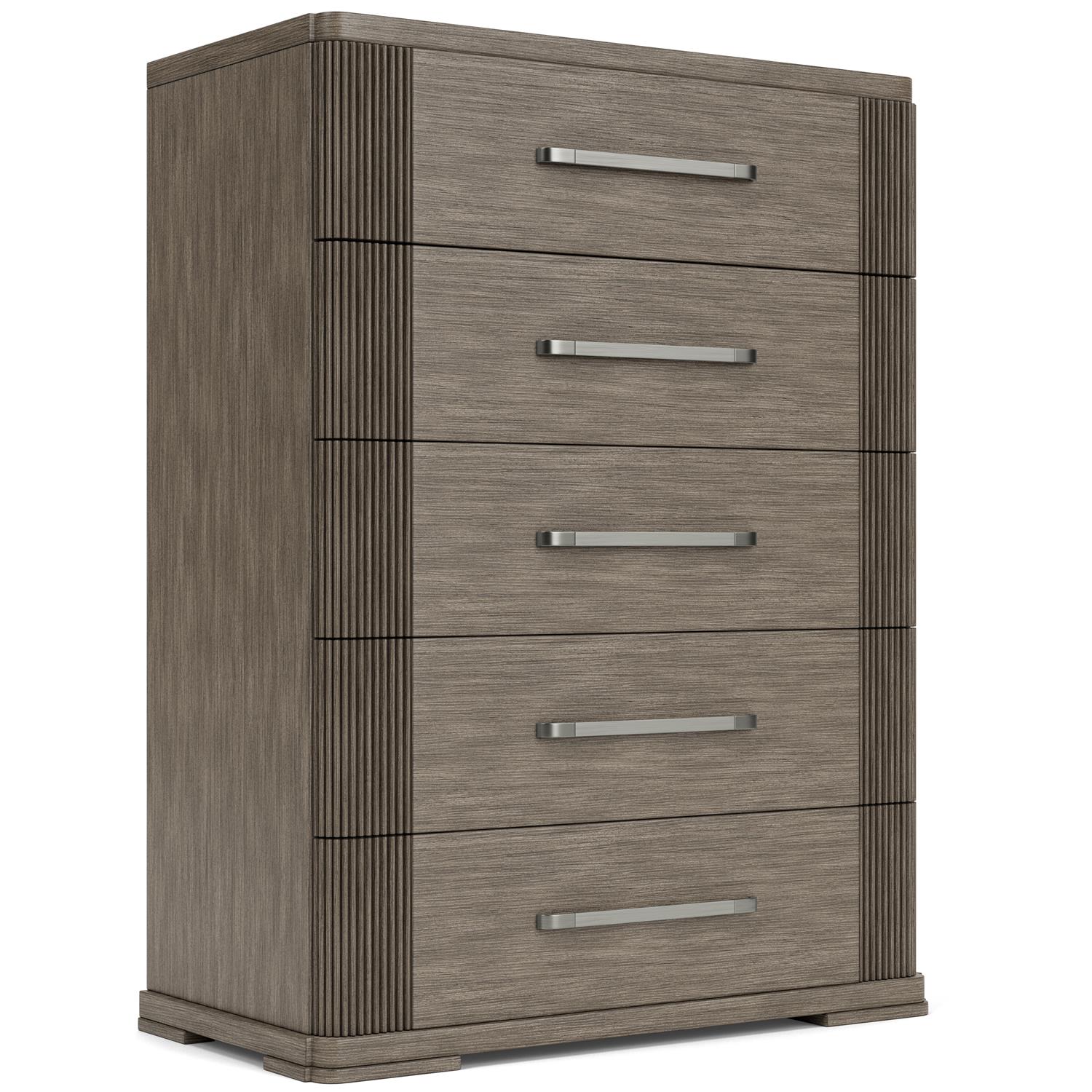 Product Description: Riverside Furniture 87165 Sariel Five Drawer Chest - Constructed of select hardwood solids and quartered Oak veneer. Vertical reeds flanking horizontal veneer gives the case a unique breakup. Radiused outside corners and stepped out block feet add to the modern styling of the group. Combination of two metal finishes give you a one-of-a-kind custom designed hardware. Five drawers are constructed with dovetail joinery and ball-bearing extension guides. Top drawer has a felt-lined bottom, Bottom drawer has a Cedar veneer bottom, All other drawers have veneered bottoms. Dust panel under bottom drawers.
