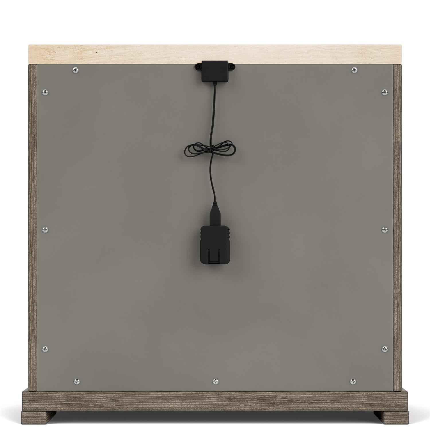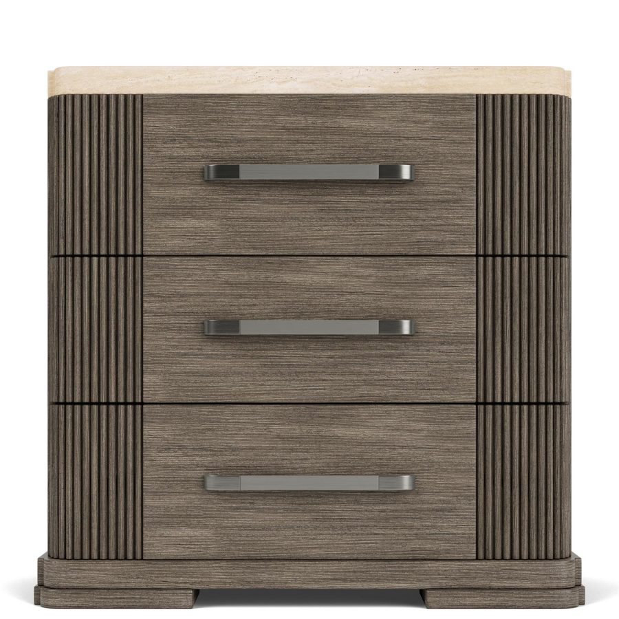 Product Description: Riverside Furniture 87168 Sariel Stone Top Three Drawer Nightstand - Constructed of select hardwood solids and quartered Oak veneer. Vertical reeds flanking horizontal veneer gives the case a unique breakup. Radiused outside corners and stepped out block feet add to the modern styling of the group. Combination of two metal finishes give you a one-of-a-kind custom designed hardware. Polished travertine stone top. Three drawers are constructed with dovetail joinery and ball-bearing extension guides. Drawers have veneered bottoms. Dust panel under bottom drawers. Dual USB/USB-c power outlet mounted on the back.