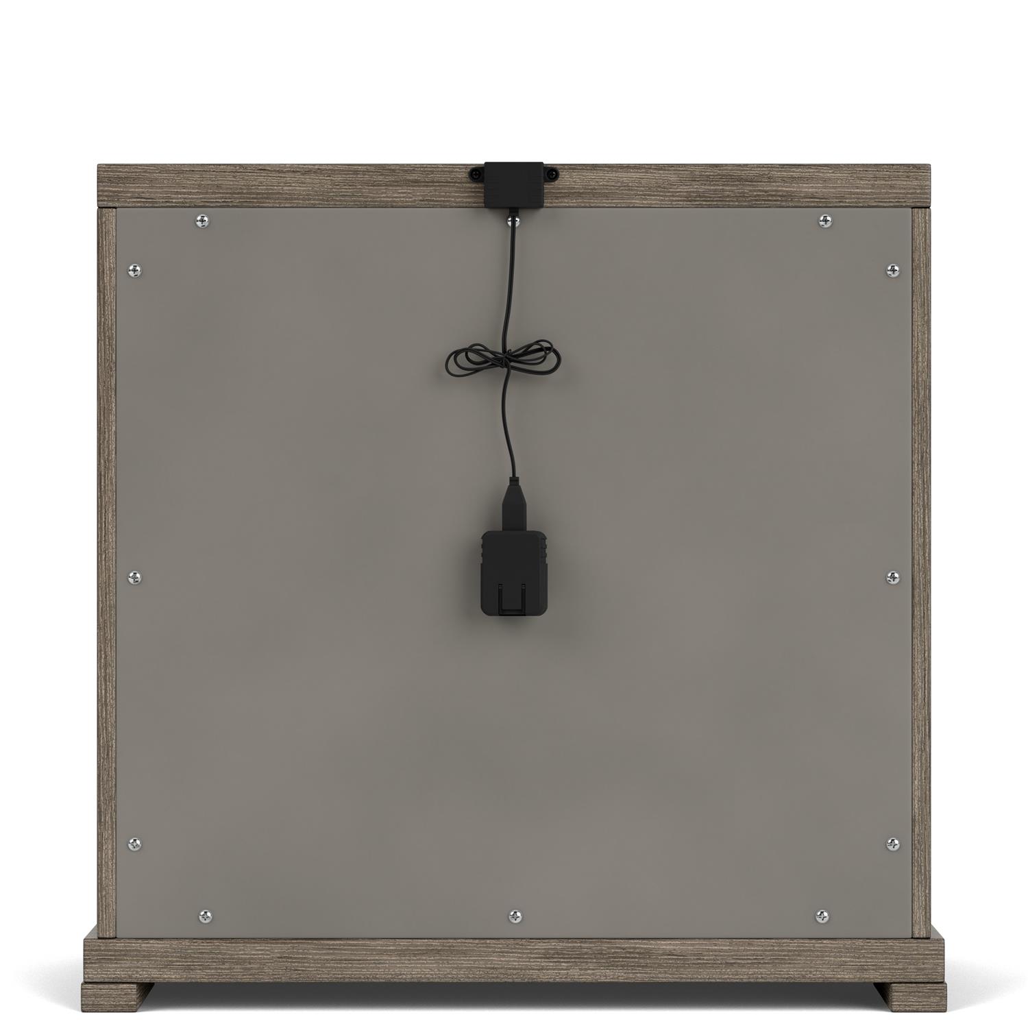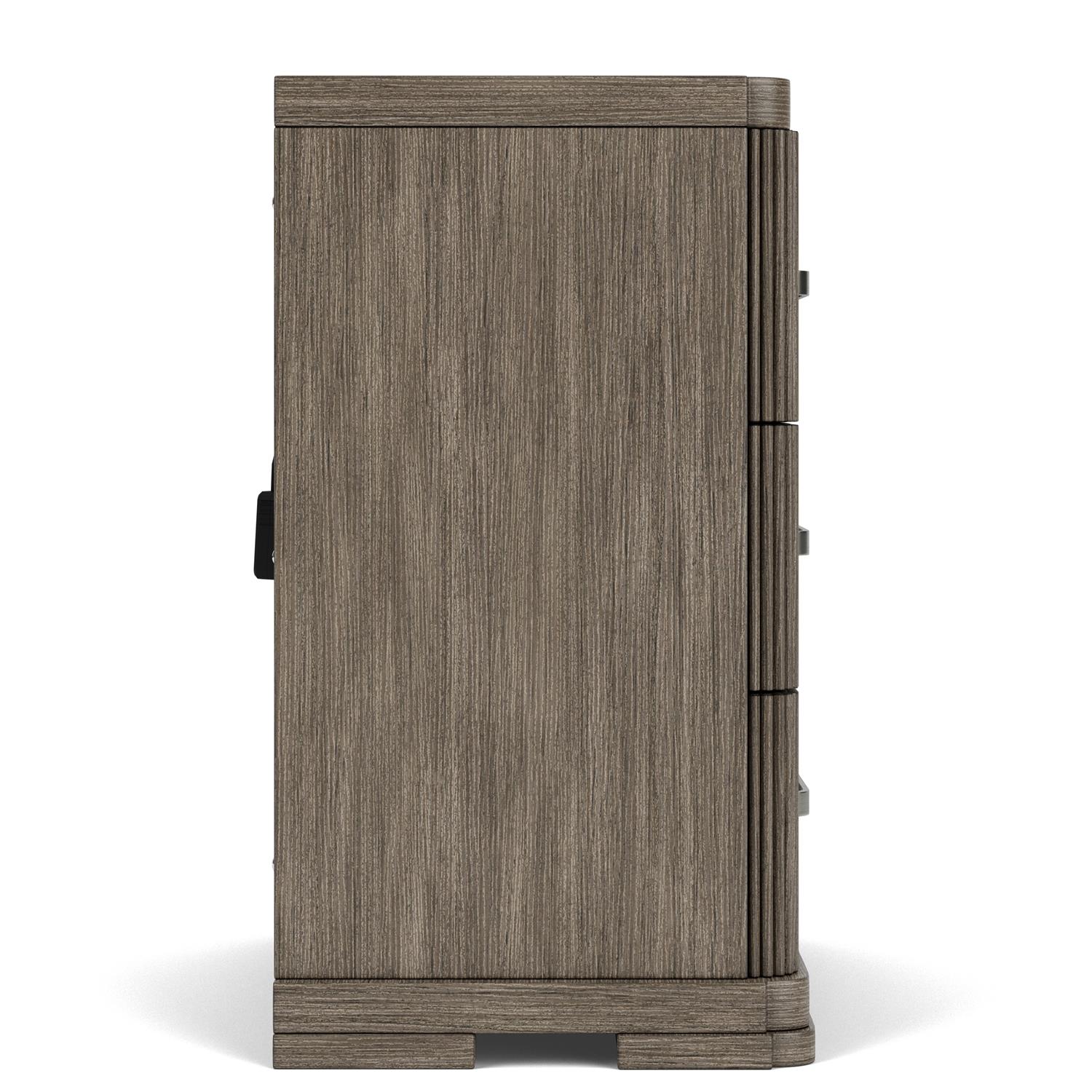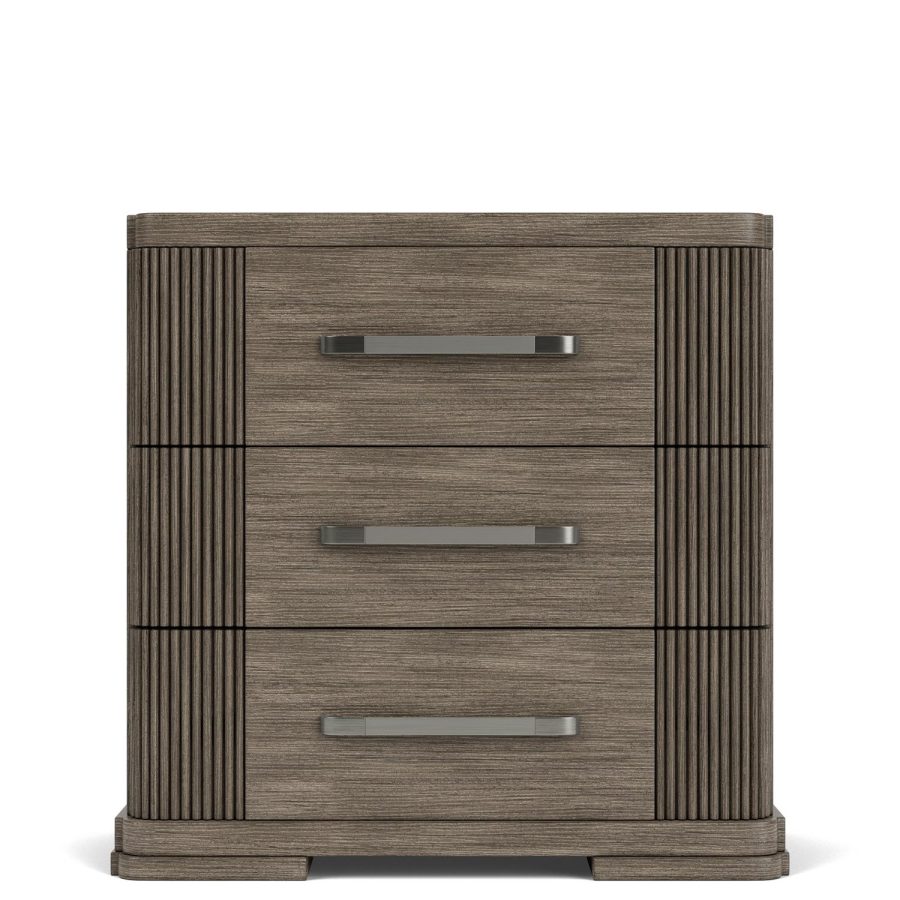 Product Description: Riverside Furniture 87169 Sariel Three Drawer Nightstand - Constructed of select hardwood solids and quartered Oak veneer. Vertical reeds flanking horizontal veneer gives the case a unique breakup. Radiused outside corners and stepped out block feet add to the modern styling of the group. Combination of two metal finishes give you a one-of-a-kind custom designed hardware. Three drawers are constructed with dovetail joinery and ball-bearing extension guides. Drawers have veneered bottoms. Dust panel under bottom drawers. Dual USB charging ports with USB and USB C located on the backside of the case top.