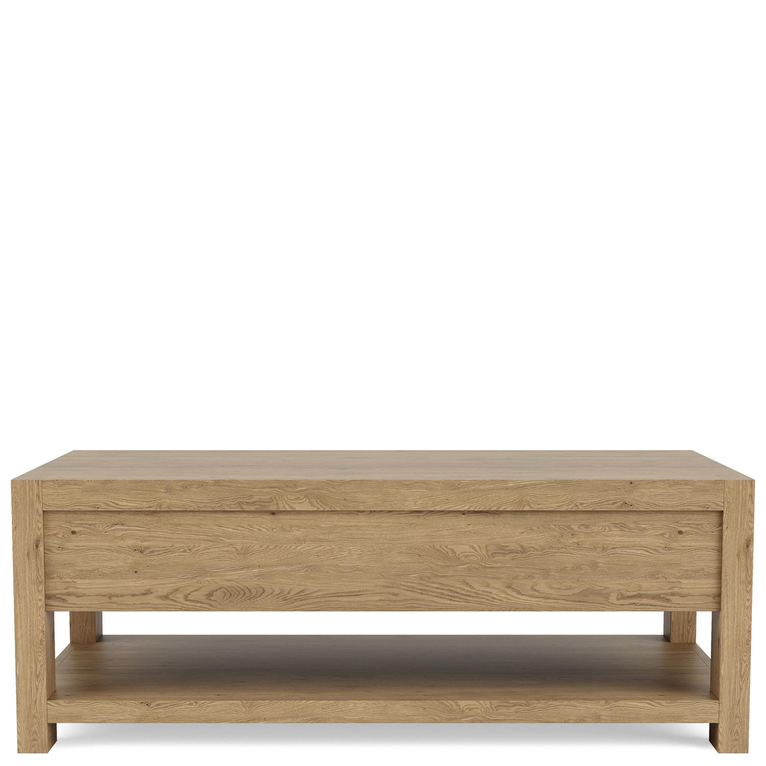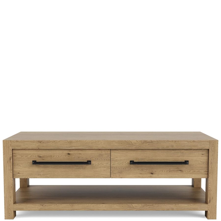 Product Description: Riverside Furniture 91002 Davie Rectangular Coffee Table - Constructed of select hardwood solids and Oak veneer. Grand scaled post with end grain detail in the top gives the table a sturdy appearance. Custom designed oversized bar pull in modern black finish. The Pale Oak wood finish enhances the natural beauty of the pin knotty Oak veneer. Two drawers constructed with dovetail joinery and ball-bearing extension guides. Fixed bottom shelf. Equipped with removable casters for convenient mobility. Never roll casters on unprotected hardwood or vinyl flooring.