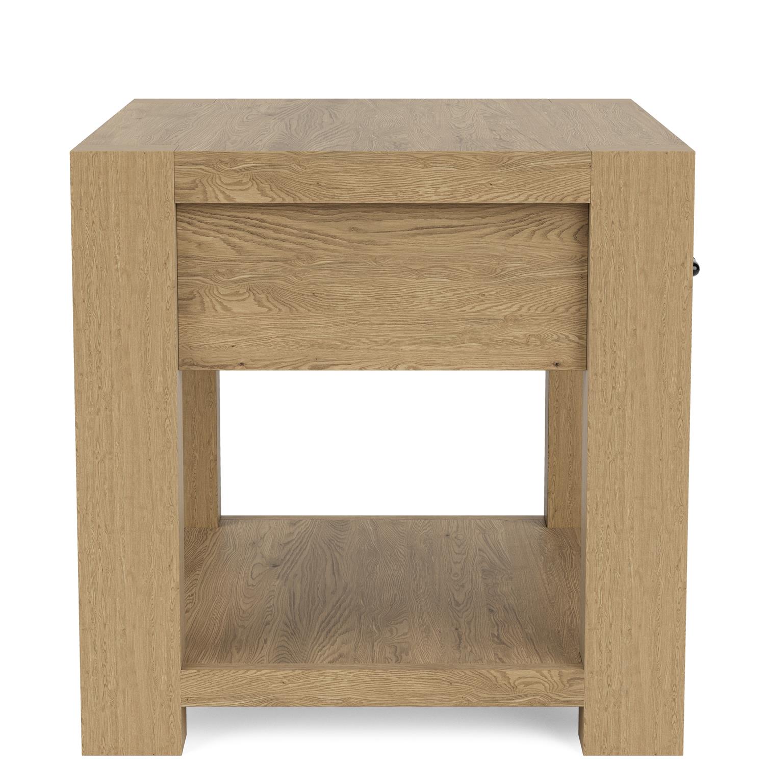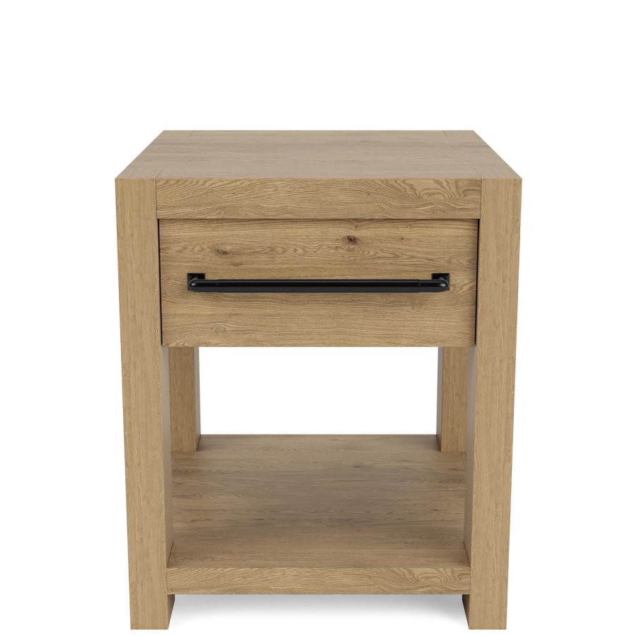 Product Description: Riverside Furniture 91009 Davie Side Table - Constructed of select hardwood solids and Oak veneers. Grand scaled post with end grain detail in the top gives the table a sturdy appearance. Custom designed oversized bar pull in modern black finish. The Pale Oak wood finish enhances the natural beauty of the pin knotty Oak veneer. One drawer constructed with dovetail joinery and ball-bearing extension guides. Fixed bottom shelf.