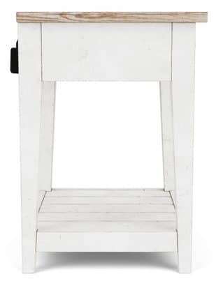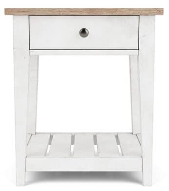 Product Description: Riverside Furniture 91468 Maddox Accent Nightstand - Constructed with select hardwood solids and Pine veneers. High/Low random planked top.One drawer constructed with dovetail joinery, ball-bearing extension guides, and a veneered bottom. Fixed bottom shelf. Dual USB/USB-c power outlet mounted on the back.