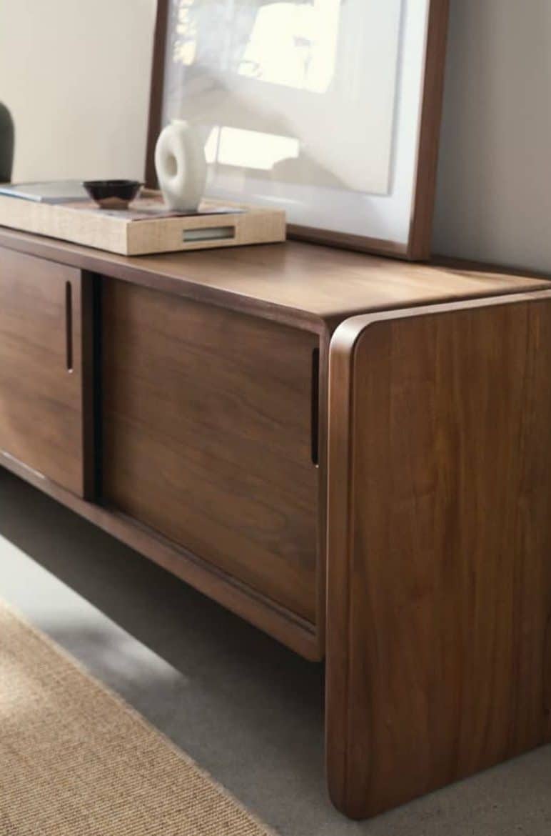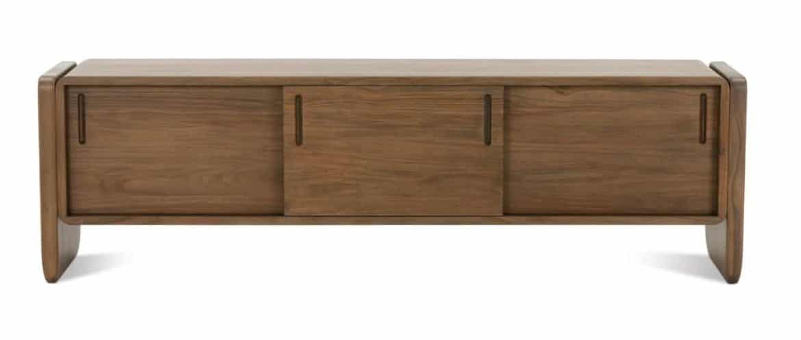 Product Description: Rowe RR-11000-601 Nova Sliding Door Credenza - Embodying the essence of modern sophistication, the Nova Alternate Credenza masterfully balances form and function with its clean lines and thoughtful design. Crafted from lightly stained solid teak, this elegant storage solution features two smooth-gliding doors and an internal shelf, offering versatile storage while maintaining a sleek, minimalist profile. The rounded edges and floating base design create an architectural statement that feels both substantial and ethereal, perfect for anchoring a media setup or serving as a distinctive storage piece in any contemporary space. Whether styled beneath a mounted television or used as a statement piece in an entryway, this credenza's honest construction and eloquent simplicity make it a versatile addition that elevates the surrounding space while harmonizing beautifully with upholstered pieces from the collection.