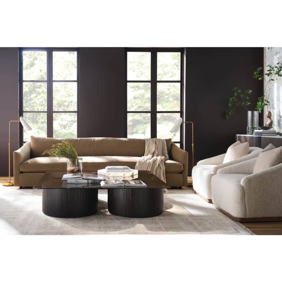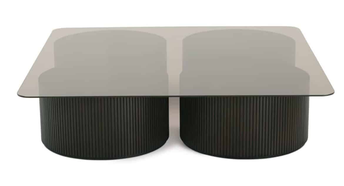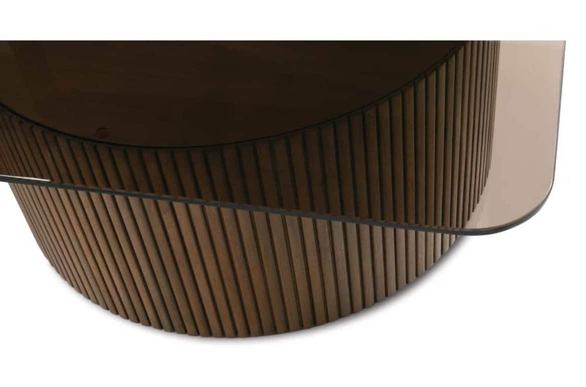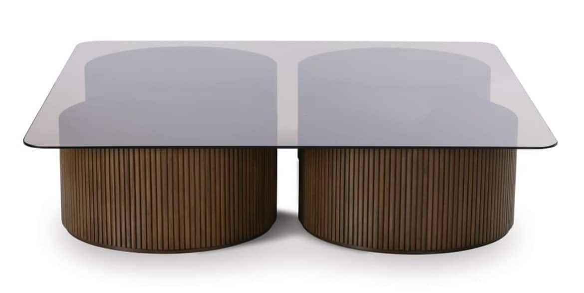 Product Description: Rowe Furniture RR-11010-300 A/B Kindred Square Cocktail Table - The Kindred Square Cocktail Table masterfully reimagines classic reeded detailing for today's sophisticated interiors, featuring two substantial cylindrical bases crowned with a sleek smoked glass top. The meticulously crafted reeded texture creates a mesmerizing rhythm of vertical lines, while the curved bottom trim adds an elegant finishing touch that speaks to exceptional attention to detail. Available in both rich Godiva and organic Sesame finishes on premium solid mahogany, this statement piece adapts seamlessly to both traditional and contemporary spaces, offering versatile styling possibilities. The substantial scale and architectural presence of this cocktail table commands attention while maintaining an airy feel through its smoked glass top, creating a perfect balance of gravitas and lightness that can anchor a living space without overwhelming it. Whether positioned in a formal sitting room or a modern open-concept space, this piece demonstrates how thoughtful design can transform functional furniture into an artistic focal point that elevates the entire room's atmosphere.
