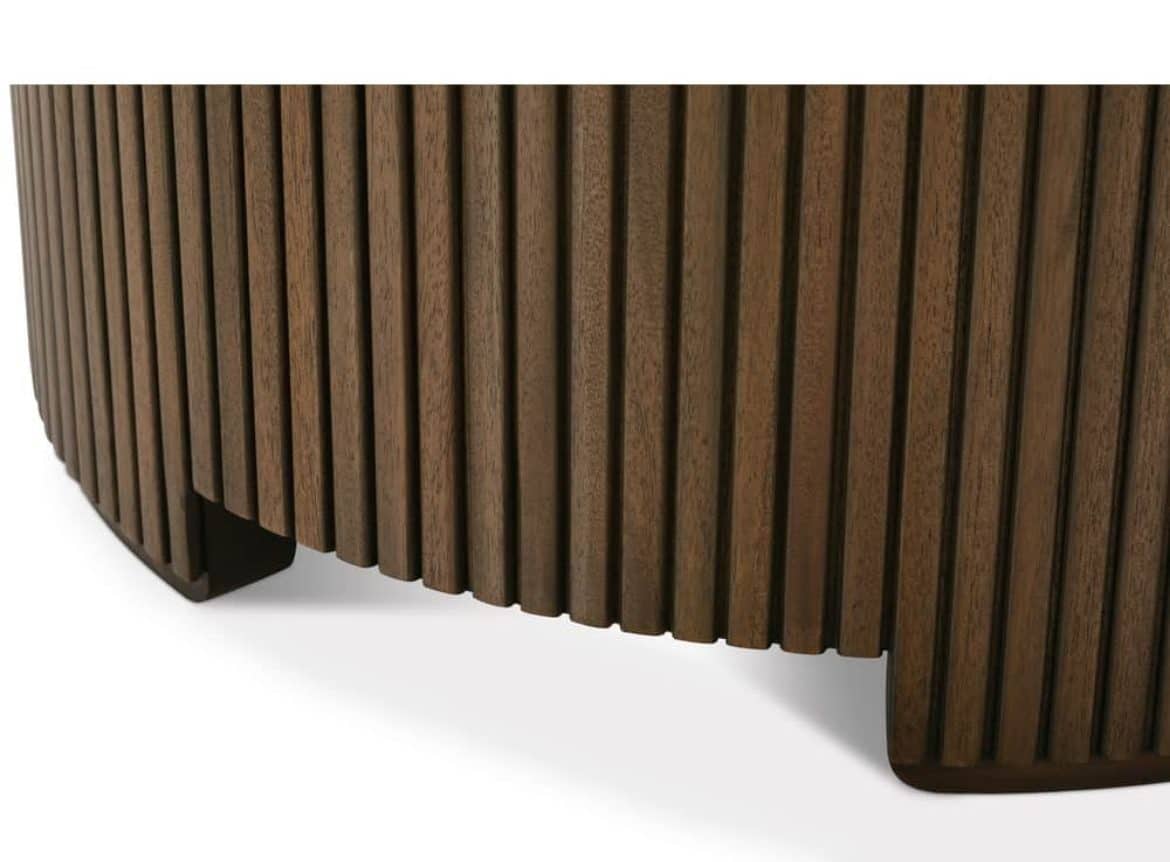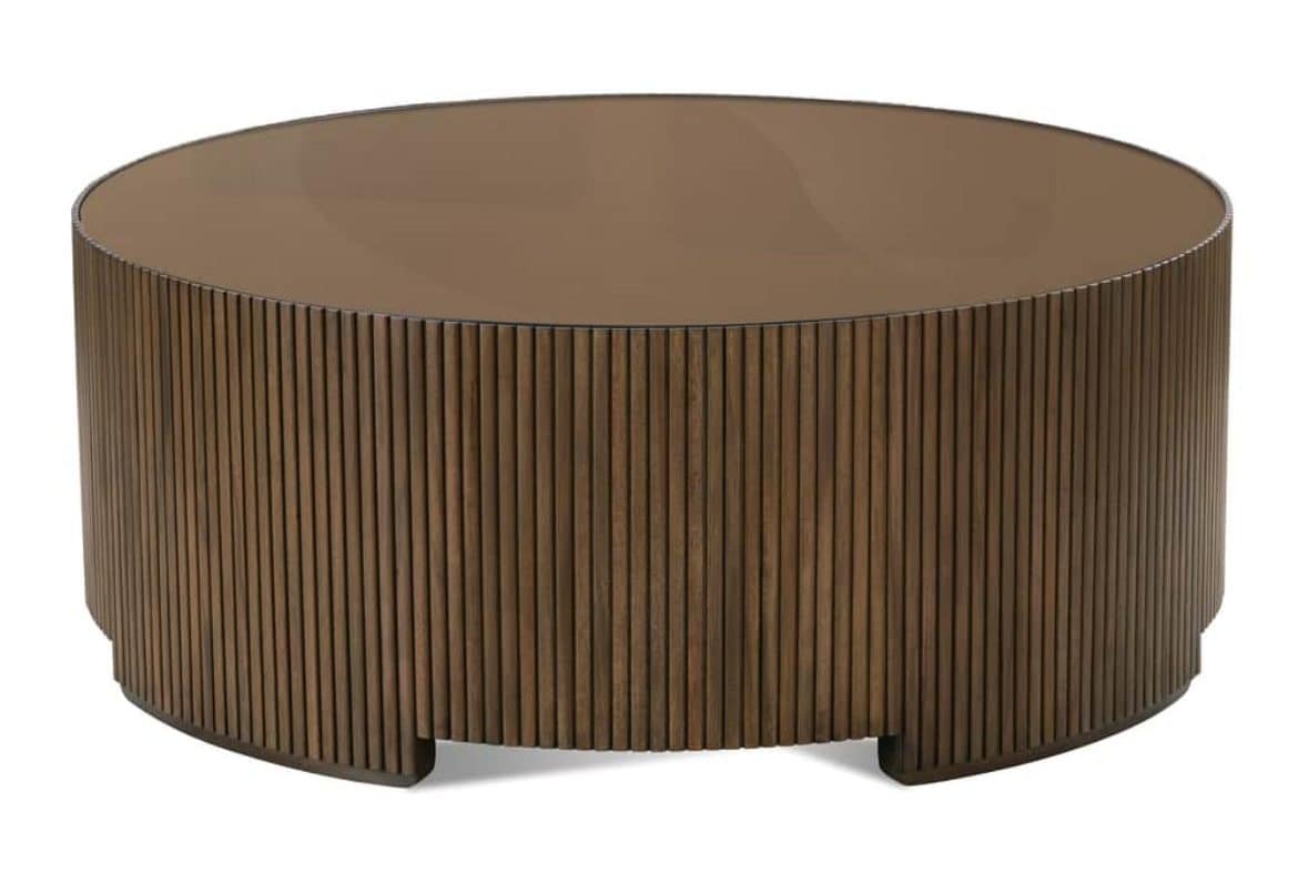 Product Description: Rowe Furniture RR-11010-311 A/B Kindred Alternate Round Cocktail Table - Elevate your living space with the Kindred Round Cocktail Table, where architectural elegance meets timeless sophistication. The meticulous reeded detailing wrapping around this statement piece creates a mesmerizing rhythm of vertical lines, while the gracefully curved base adds an unexpected softness to its commanding presence. Available in rich Godiva or organic Sesame finishes on premium solid mahogany, this artfully crafted table delivers both visual drama and functional sophistication through its substantial scale and carefully considered proportions.This versatile centerpiece seamlessly bridges classic and contemporary aesthetics, making it an extraordinary anchor for your living room that will continue to captivate and inspire for years to come.