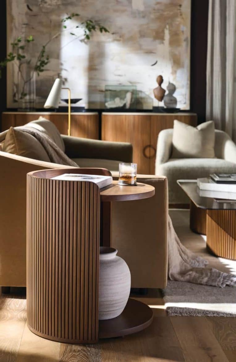 Product Description: Rowe RR-11010-336 Kindred Alternate Round End Table - The Kindred Round End Table masterfully merges architectural elegance with functional design through its distinctive reeded surface detailing - a hallmark of sophisticated furnishings. This solid solid mahoganypiece commands attention with its gracefully curved silhouette and rhythmic vertical grooves, creating a mesmerizing interplay of light and shadow that adds depth and visual interest to any room. Available in both rich Godiva and light Sesame finishes, this versatile end table features two circular platforms perfect for displaying cherished objects or providing convenient surface space, while its drum-style profile creates an engaging sculptural presence that works beautifully in both classic and contemporary settings. The table's meticulous craftsmanship shines through in every detail, from its precisely carved reeding to its thoughtfully proportioned shelving, making it an enduring addition to your carefully curated space.