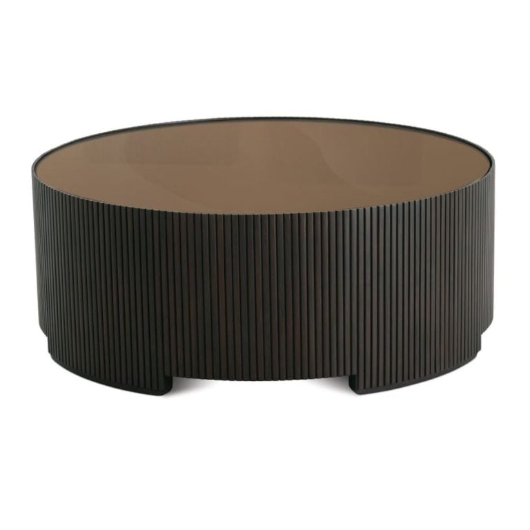 Product Description: Rowe Furniture RR-11011-311 A/B Kindred Alternate Round Cocktail Table - Elevate your living space with the Kindred Round Cocktail Table, where architectural elegance meets timeless sophistication. The meticulous reeded detailing wrapping around this statement piece creates a mesmerizing rhythm of vertical lines, while the gracefully curved base adds an unexpected softness to its commanding presence. Available in rich Godiva or organic Sesame finishes on premium solid mahogany, this artfully crafted table delivers both visual drama and functional sophistication through its substantial scale and carefully considered proportions.This versatile centerpiece seamlessly bridges classic and contemporary aesthetics, making it an extraordinary anchor for your living room that will continue to captivate and inspire for years to come.