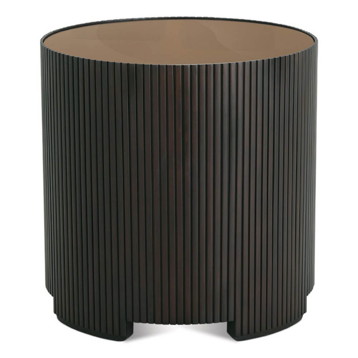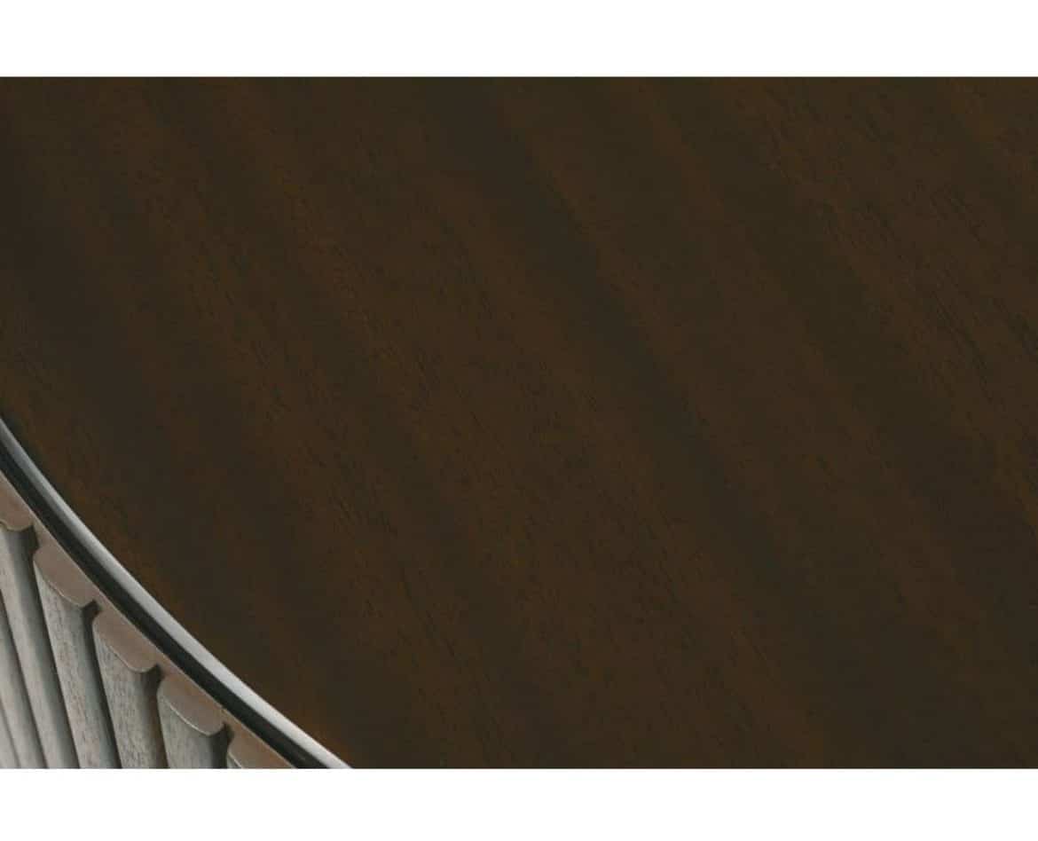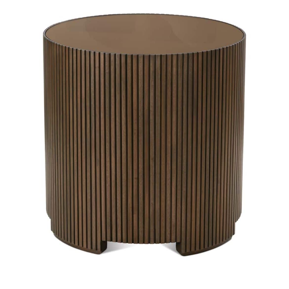 Product Description: Rowe Furniture RR-11011-335 A/B Kindred Round End Table - The Kindred Round End Table masterfully reimagines classic reeded detailing for today's sophisticated interiors, featuring precisely carved vertical lines that create a mesmerizing interplay of light and shadow across its cylindrical form. Available in rich Godiva or lighter Sesame finishes on premium solid mahogany, this architectural accent piece pairs timeless craftsmanship with contemporary elegance through its seamless curved design and thoughtful bottom trim details. The table's substantial presence and clean silhouette make it an versatile anchor piece that can command attention while harmoniously complementing both traditional and modern settings. Whether placed beside a plush sofa or anchoring a seating arrangement, this artfully executed end table brings a sense of ordered tranquility and enduring style to any room, proving that true sophistication lies in the perfect balance of form and function.