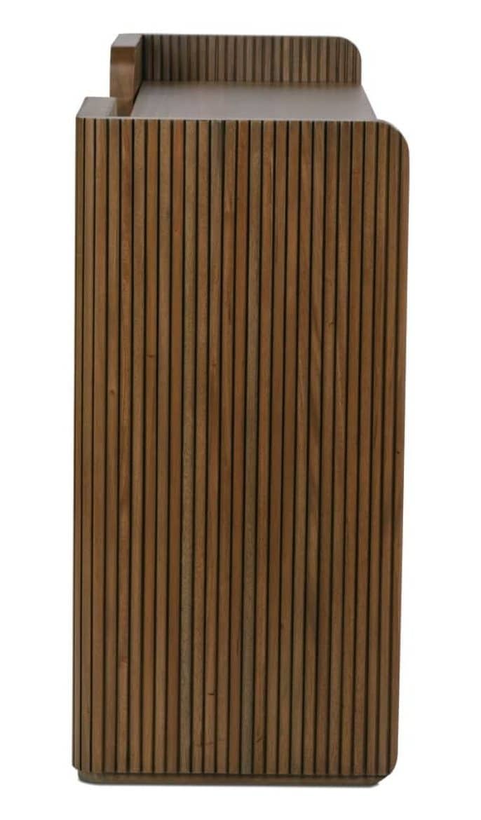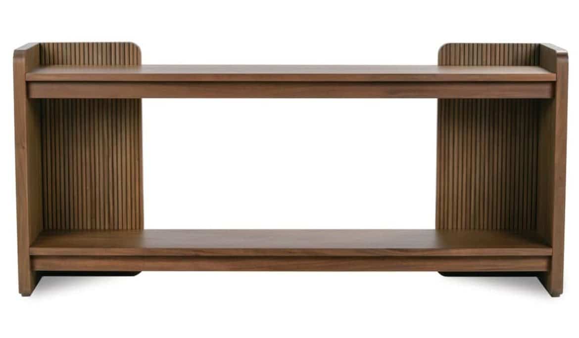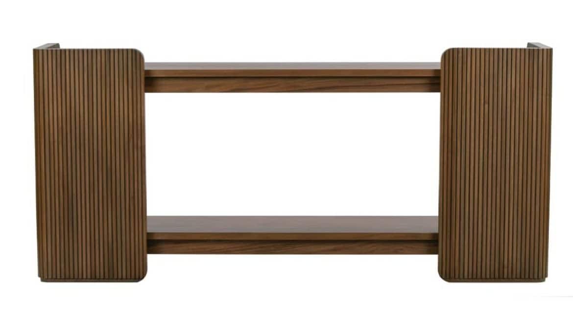 Product Description: Rowe Furniture RR-11011-400 A/B Kindred Console Table - The Kindred Console Table masterfully balances architectural elegance with modern functionality through its striking reeded surface detail - a design element that adds sophisticated visual rhythm while paying homage to classic architectural forms. Available in rich Godiva or light Sesame finishes on premium solid mahogany, this versatile piece features clean lines accented by gentle curves at the sides and thoughtfully detailed bottom trim that speaks to meticulous craftsmanship. The table's generous proportions and dual-shelf design offer both display space and practical storage, while its refined silhouette allows it to serve as either a graceful anchor piece in an entryway or a sophisticated media console in a living space. Whether styled with curated objects d'art, family photographs, or essential electronics, this console's timeless design and quality construction ensure it will remain a cherished piece that elevates any interior story.