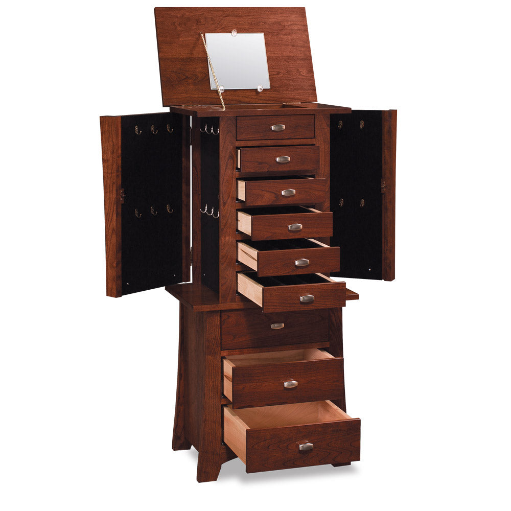 Product Description: Simply Amish MSLJA Loft Jewelry Armoire - Features flip-top mirror and black nylon velvet interior in the upper drawers and doors. Sides open for necklace storage
