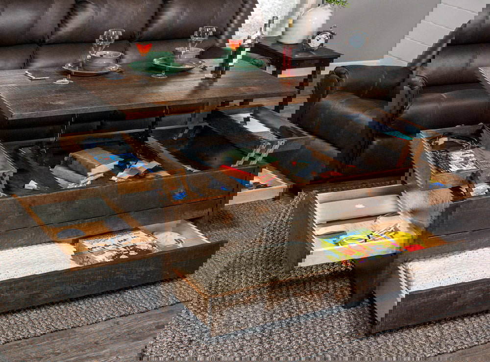Product Description: Simply Amish QSK-LOGRE-25C4A Greenville Incognito Coffee Table Quickship - Features a lift top, two extending compartments, three secret drawers, a hidden compartment in the back, and push to open drawers