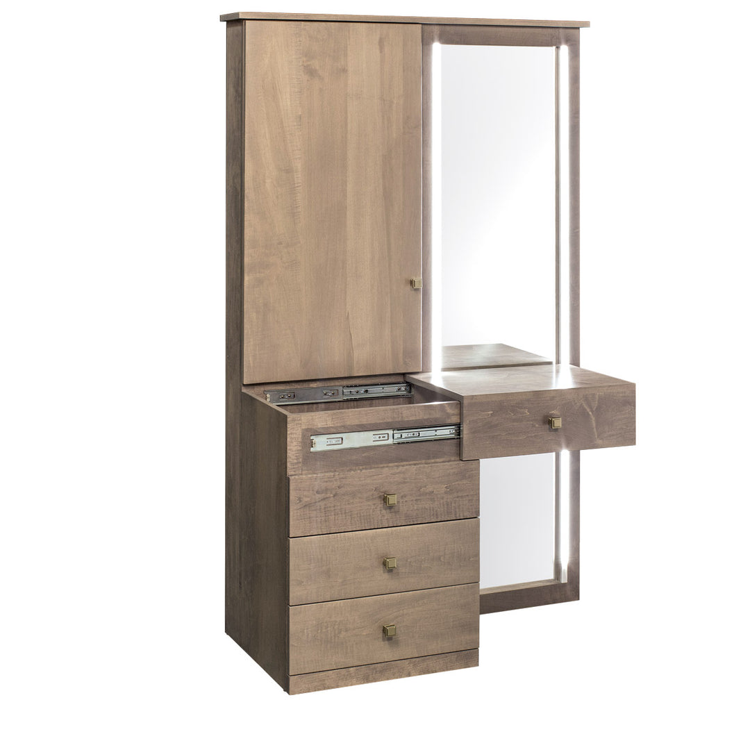 Product Description: Simply Amish SSINC-21B0 Incognito Vanity - Features include: 2 adjustable shelves, Outlet & USB ports for chargers behind door, LED lighting on mirror, Jewelry pullout, Top drawer slides to become a makeup shelf with storage area, 2 full extension drawers.